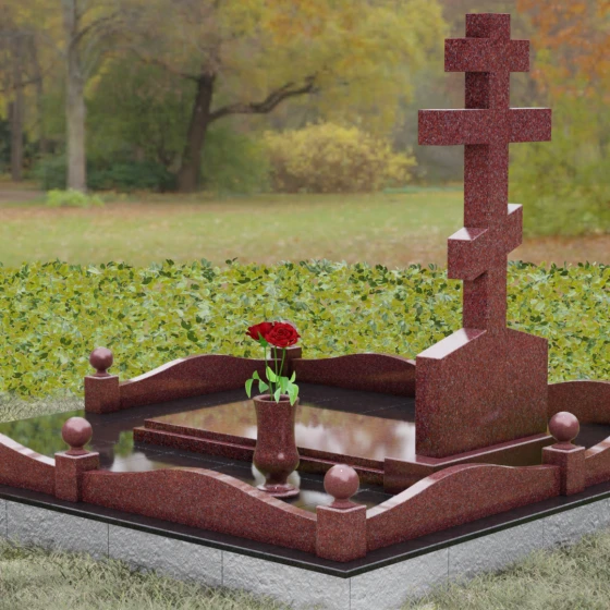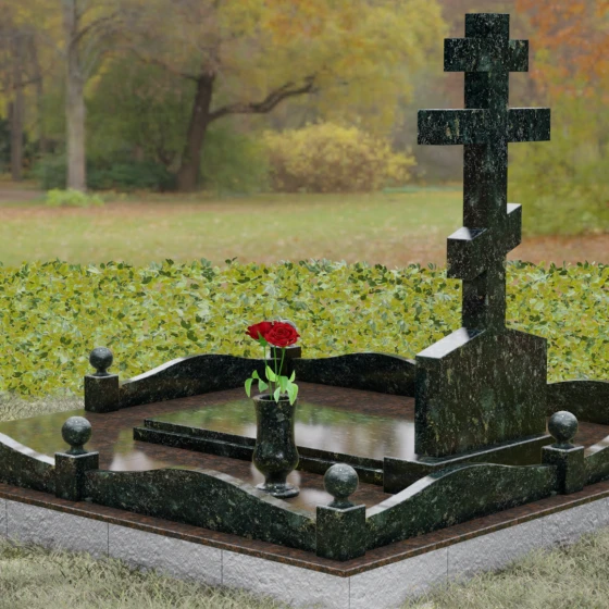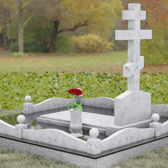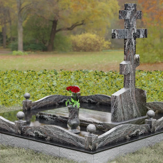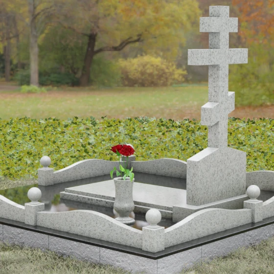 Восьмиконечный крест в данной модели олицетворяет духовную защиту и надежду на воскресение. Его строгая геометрия в сочетании с массивным постаментом символизирует незыблемость веры и стойкость памяти. Отказ от лишнего декора в пользу чистоты линий делает это надгробие из натурального камня универсальным и благородным. Форма ансамбля транслирует покой и защиту, превращая участок захоронения в сакральное пространство, отделенное от мирской суеты. Каменные шары, венчающие столбики ограждения, добавляют классические нотки, отсылая к традициям дворцовой и парковой архитектуры, что подчеркивает торжественность момента.