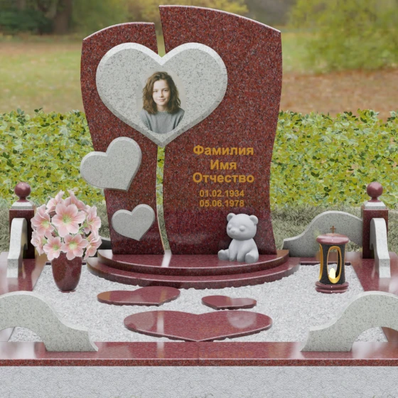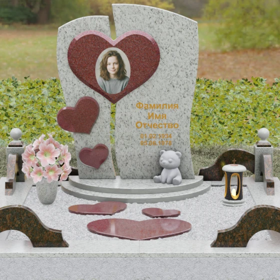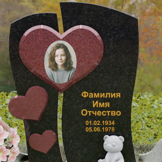 Оформление: Уникальная геометрия этого надгробия сама подсказывает идеальное расположение гравировки. Крупное центральное сердце словно создано для размещения портрета — здесь он будет главным смысловым акцентом, защищенным символом любви. Правую, более широкую часть плиты, рекомендуется использовать для нанесения Фамилии, Имени, Отчества и дат жизни. Здесь же останется достаточно места для проникновенной эпитафии или дополнительного декоративного элемента, например, небольшой виньетки или креста.