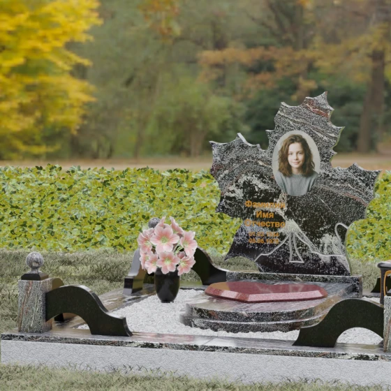 Данная мемориальная композиция — это воплощение глубокого уважения и вечной памяти, облаченное в художественную форму. Выбор формы кленового листа не случаен: в мировой символике он олицетворяет силу духа, красоту жизненного пути и мудрость. Каждая линия этой стелы пропитана эстетикой природного изящества. Резные края листа выполнены с филигранной точностью, создавая сложный, многогранный силуэт, который выделяется на фоне классических строгих форм. Плавные изгибы и отсутствие агрессивных углов призваны дарить чувство покоя и умиротворения, подчеркивая, что душа близкого человека обрела вечный приют в гармонии.