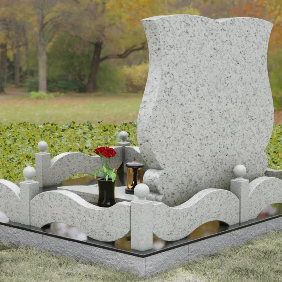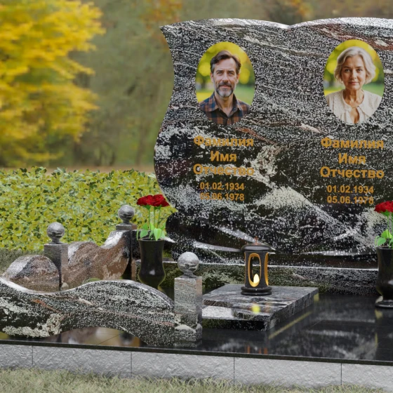 Кому подойдет: Эта модель разработана специально для парных захоронений, становясь достойным символом неразрывной связи. Она идеально подходит для увековечивания памяти родителей, супружеских пар или близких родственников. Возможность исполнения в светлых тонах (Мансуровский гранит или мрамор Тассо) придаст мемориалу возвышенную легкость, тогда как темные виды гранита подчеркнут статусность и строгую торжественность места упокоения. Благодаря своей сложной геометрии и обилию декоративных элементов, комплекс выглядит дорого и самодостаточно в любых условиях освещения.