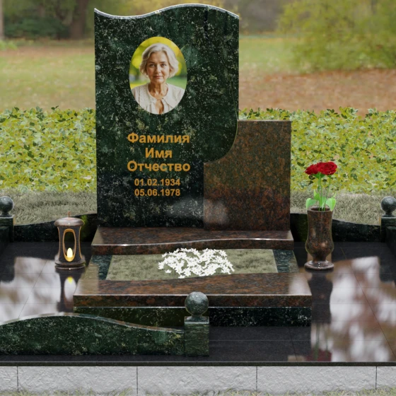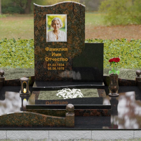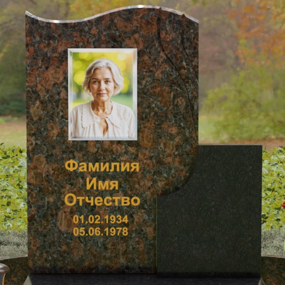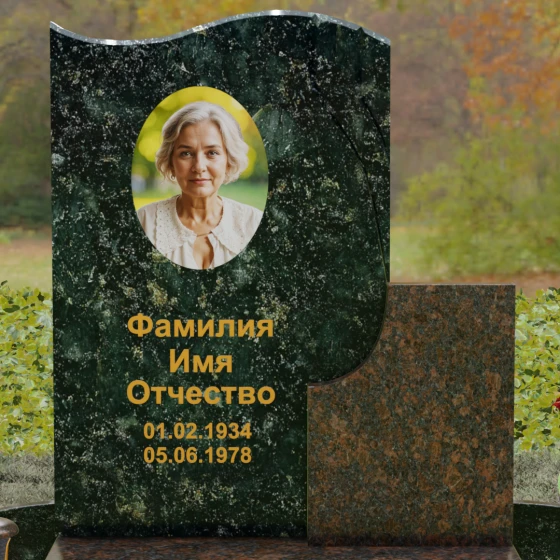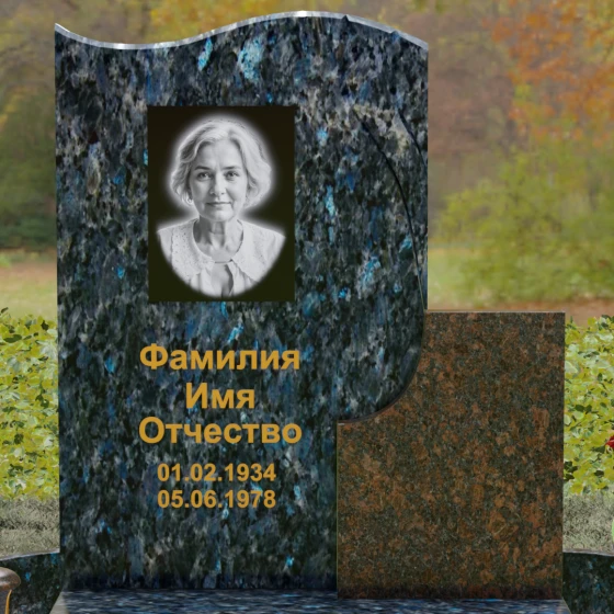 Конструкция является комбинированной, что открывает широкие возможности для индивидуализации. Основной вертикальный блок гармонично дополнен вторым, более приземистым прямоугольным элементом из камня другого оттенка. Такое сочетание фактур и цветов позволяет создать уникальный художественный образ. Портрет, нанесенный в изящной овальной технике или методом лазерной гравировки, дополняется золоченой каллиграфией, которая выглядит особенно благородно на темном фоне полированного гранита.