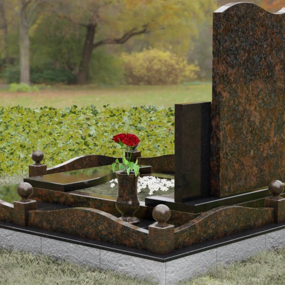 Мемориальный ансамбль включает в себя не только стелу, но и продуманную систему благоустройства участка, что придает захоронению законченный и торжественный вид. Основание покоится на прочном гранитном цоколе, который обеспечивает устойчивость всей конструкции на десятилетия. Вместо открытого грунта по всей площади участка уложена монолитная надгробная плита, что не только подчеркивает монументальность комплекса, но и несет практическую функцию, защищая место памяти от прорастания травы. Периметр оформлен изящным каменным бордюром со столбиками, каждый из которых увенчан идеально отполированным декоративным шаром — символом завершенности и вечности. Композицию завершает массивная гранитная ваза, выполненная в единой стилистике с памятником.