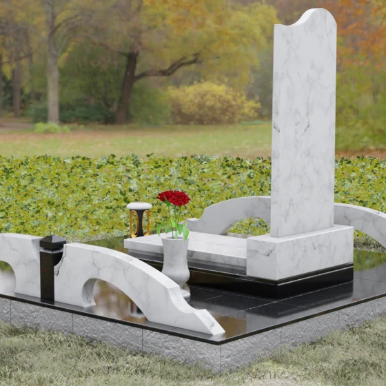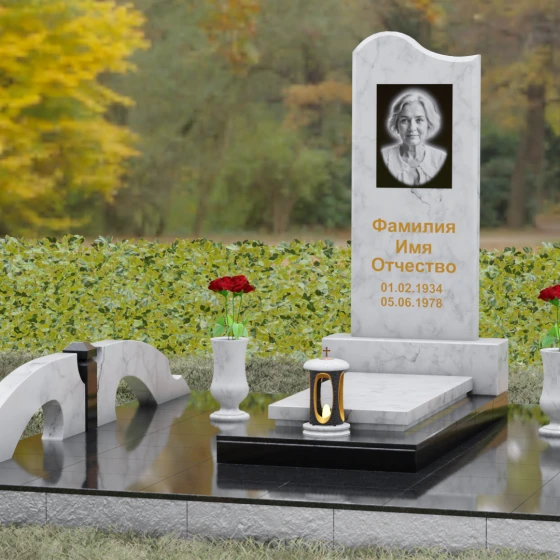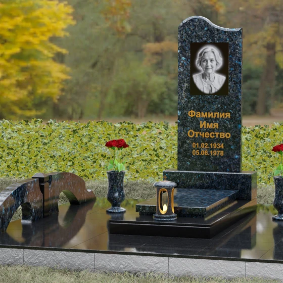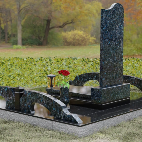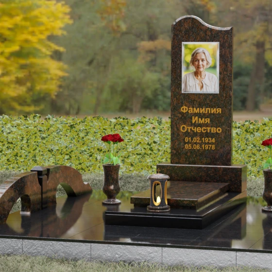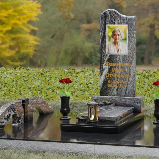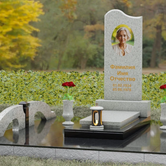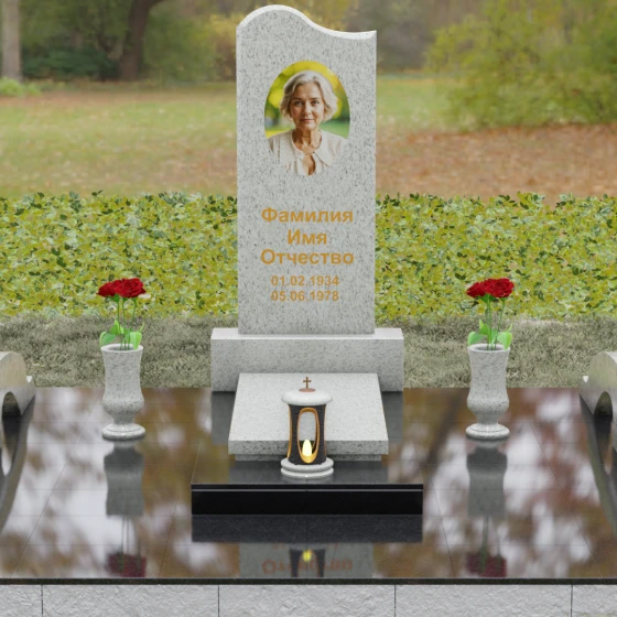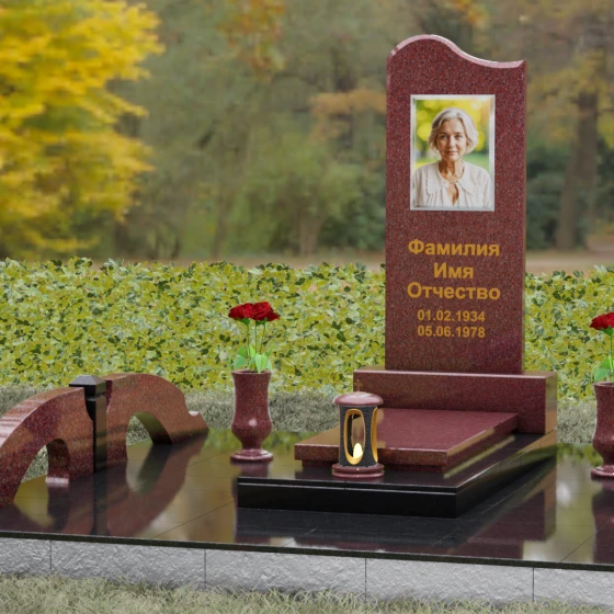 Данная мемориальная композиция предполагает целостное оформление участка. Стела устанавливается на массивный каменный постамент, который служит надежным фундаментом и придает всей конструкции величественность. В едином ансамбле с основным монументом могут быть выполнены изящные вазы, расположенные по бокам. Эти элементы декора, выточенные из того же благородного материала, позволяют всегда содержать место памяти в порядке, украшая его живыми цветами. Использование цельных каменных элементов в основании исключает прорастание сорной травы и значительно упрощает уход, сохраняя первозданный вид комплекса на десятилетия.