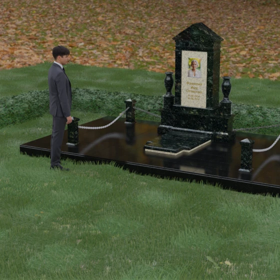 Сложная геометрия изделия подчеркивается безупречной зеркальной полировкой, в которой отражается мир, создавая ощущение глубины и пространства. Мемориальная композиция включает в себя не только основное изваяние, но и полностью благоустроенный участок. Основанием служит массивный гранитный цоколь, обеспечивающий вековую устойчивость всей конструкции. Вместо открытого грунта используется сплошная надгробная плита с идеальной фаской по периметру. Такая конфигурация не только придает захоронению завершенный, парадный вид, но и значительно упрощает уход за местом памяти, исключая появление сорняков и скопление влаги. Особое внимание уделено деталям: по углам участка установлены резные гранитные столбики с конусообразными вершинами, соединенные декоративными цепями. Этот элемент создает символическую границу, отделяющую зону вечного покоя.