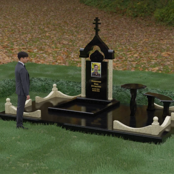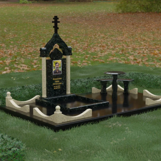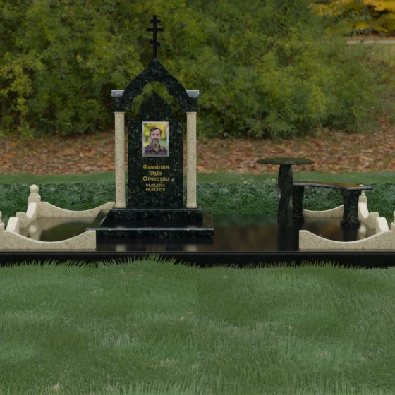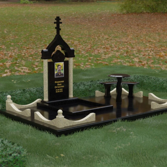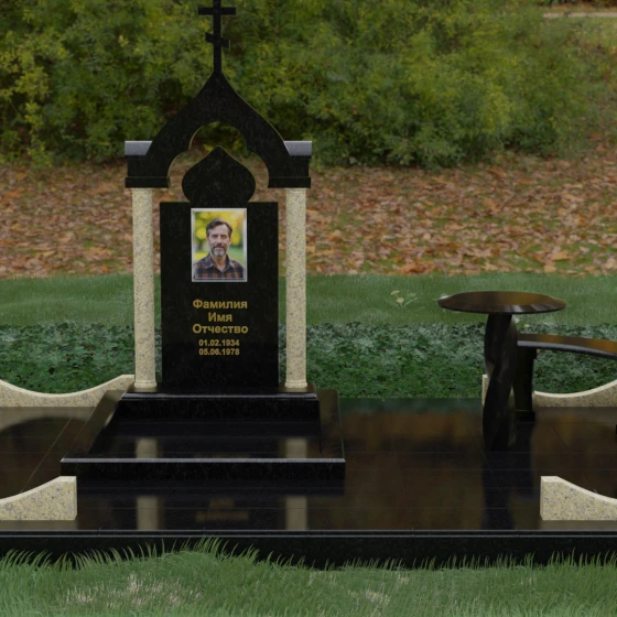 Центральное место в композиции занимает величественная стела, выполненная в редкой архитектурной форме часовни. Основное полотно из глубокого черного камня с зеркальной полировкой обрамлено двумя светлыми гранитными колоннами, которые поддерживают многоярусный свод. Верхушка выполнена в виде традиционной православной арки — «кокошника», которую венчает изящный восьмиконечный крест. Игра контрастов между антрацитовым фоном и молочно-бежевыми вставками создает эффект внутреннего свечения, подчеркивая торжественность момента.
