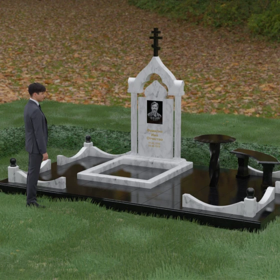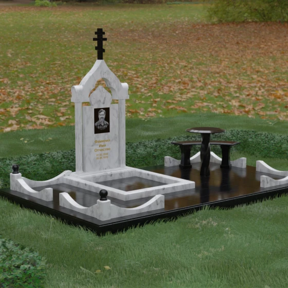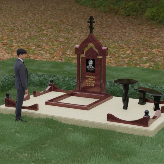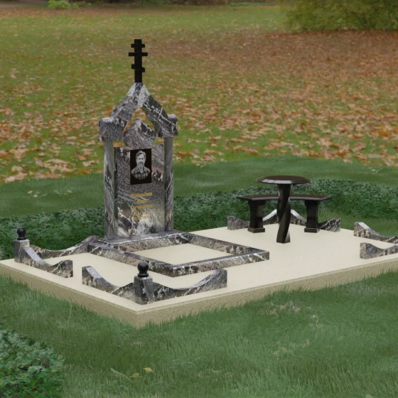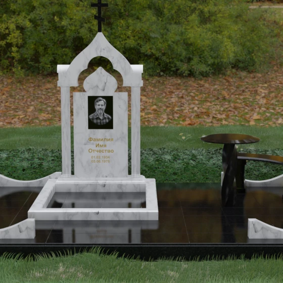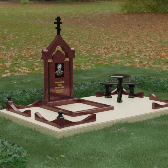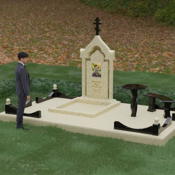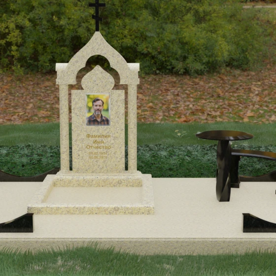 Форма часовни в этой модели выбрана не случайно: она символизирует небесный покров и защиту души в ином мире. Колонны по бокам стелы олицетворяют жизненную опору, твердость характера и верность принципам, которые покойный нес при жизни. Плавные, волнообразные изгибы элементов ограждения отражают бесконечность жизненного пути и конечное обретение покоя в тихой гавани. Православный крест, возвышающийся над всей композицией, является главным символом надежды на воскрешение и духовную победу над тлением. Каждый изгиб камня здесь говорит о любви, которая сильнее смерти.