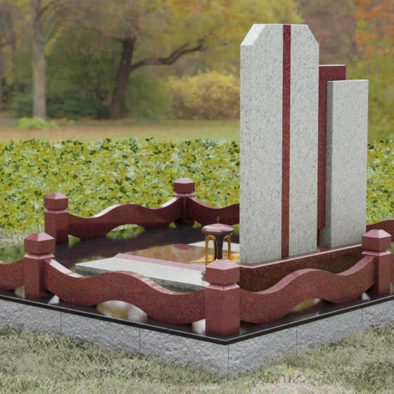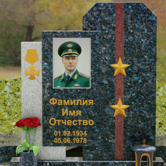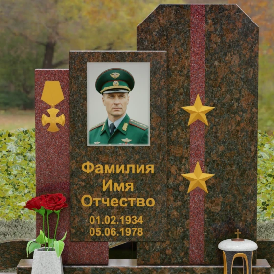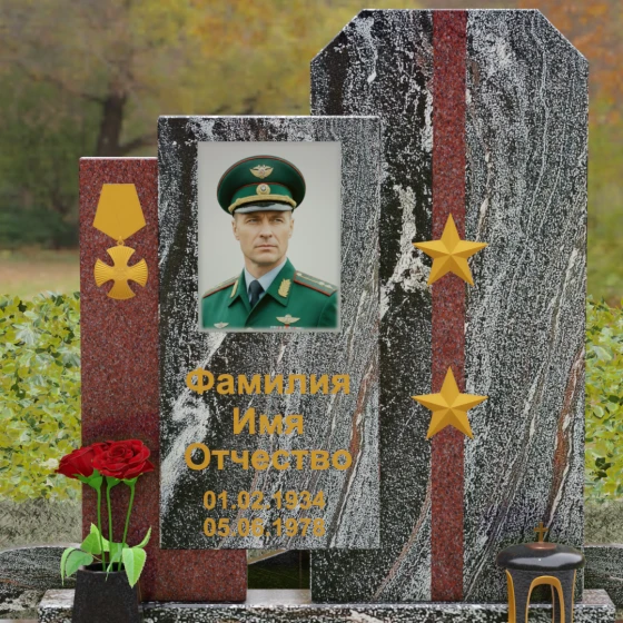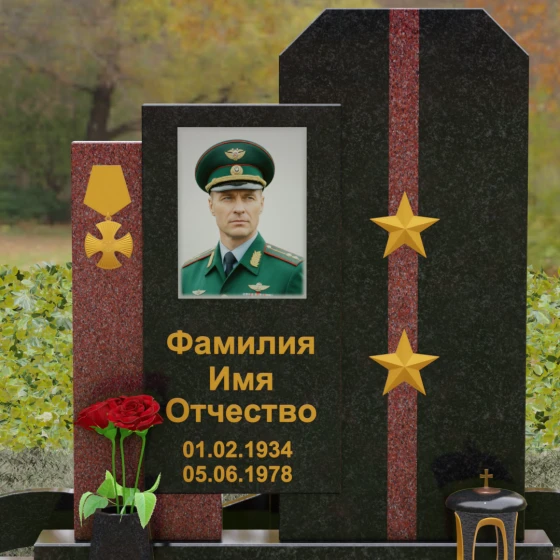 Выбор мемориального комплекса — это всегда поиск баланса между строгостью формы и глубиной чувств. Модель Артикул 201 представляет собой сложную архитектурную композицию, которая идеально подходит для увековечивания памяти сильного, волевого человека, посвятившего жизнь служению. Надгробие из натурального камня состоит из трех вертикальных элементов, создающих динамичный, ступенчатый силуэт. Центральная стела, предназначенная для размещения портрета и основной информации, обрамлена боковыми пилонами из контрастного красного гранита. Такая геометрия символизирует устойчивость, надежную опору и непоколебимость духа. Сочетание строгих прямых линий и аккуратных фасок на вершинах придает памятнику торжественный, парадный вид, подчеркивая заслуги и особый статус усопшего.