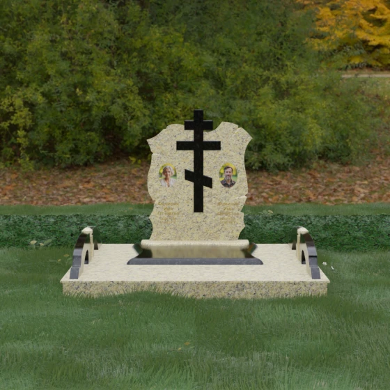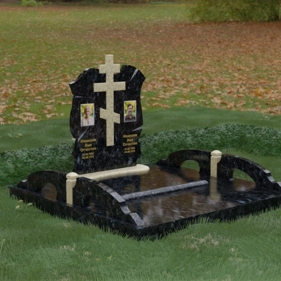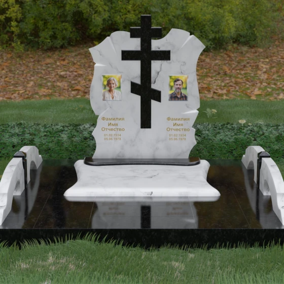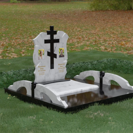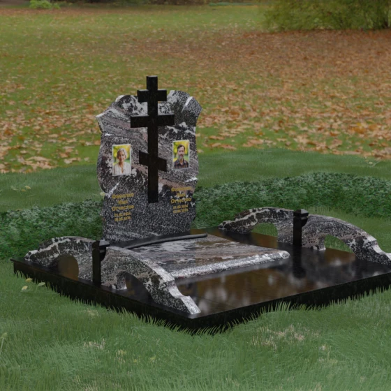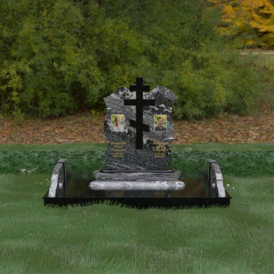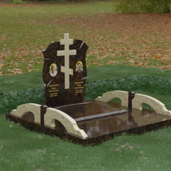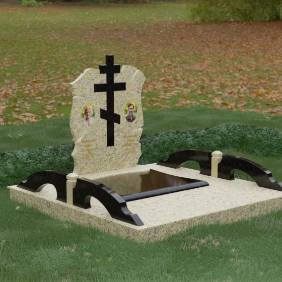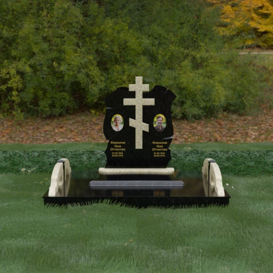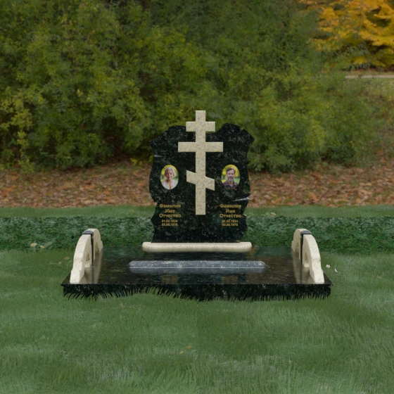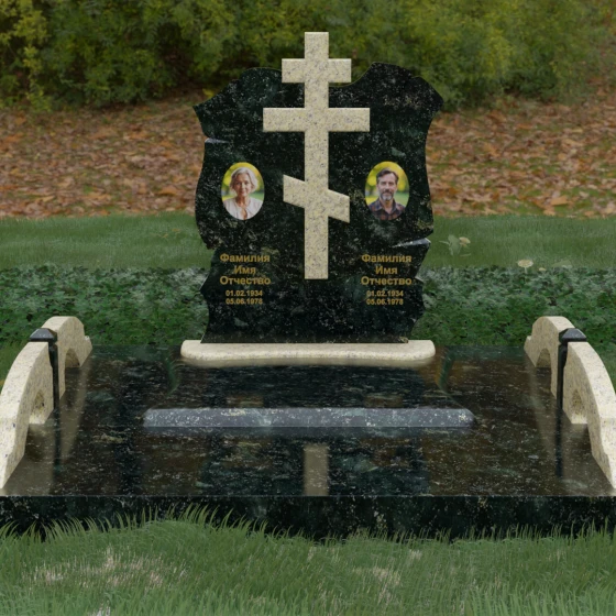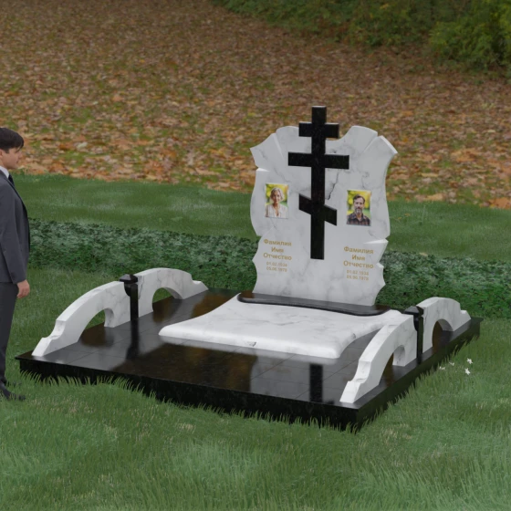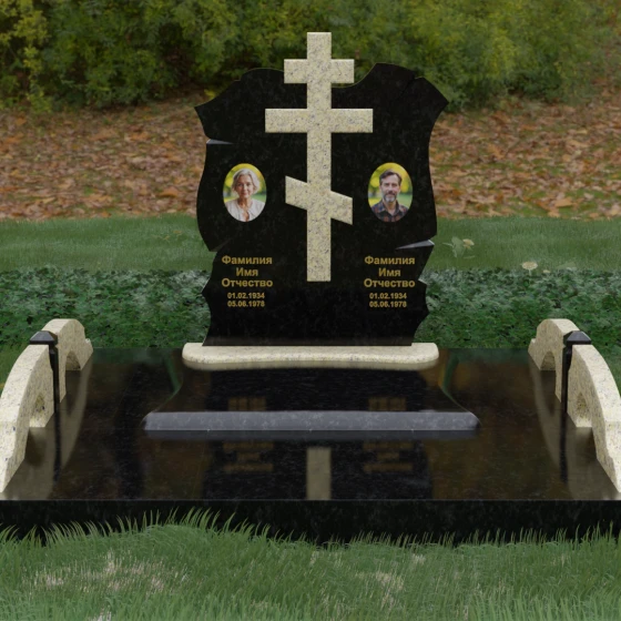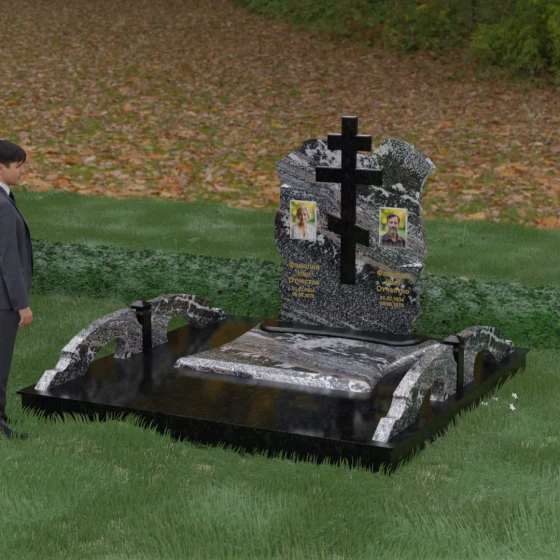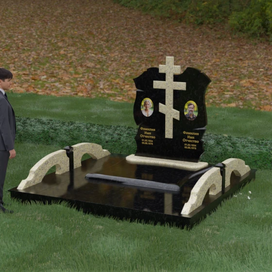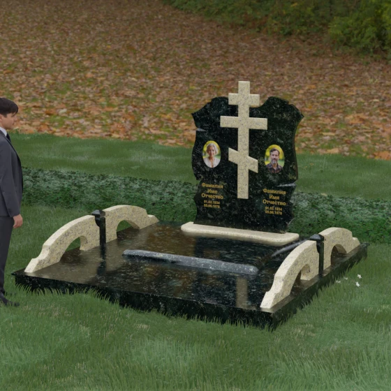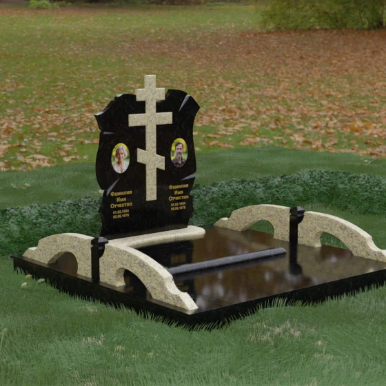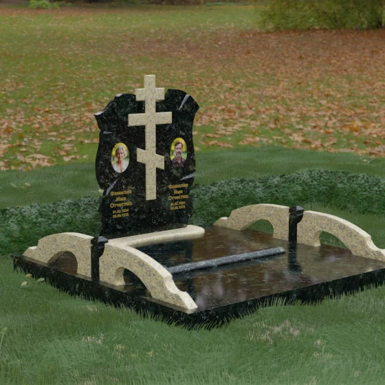 Конструкция продумана до мельчайших деталей, включая боковые декоративные элементы в виде изящных арок-«мостиков». Эти резные столбики с плавными изгибами соединяют стелу с границами участка, создавая ощущение защищенности и уединения. Они выполнены из того же светлого камня, что и центральный крест, создавая ритмичный цветовой контраст с темным основанием. Массивный цоколь придает всей конструкции устойчивость, визуально приподнимая мемориал над уровнем земли. На широкой горизонтальной стеле идеально располагаются два портрета, что делает эту модель безупречным выбором для семейного захоронения. Симметричное расположение медальонов и гравировок позволяет сохранить баланс и эстетическую целостность всей композиции, выделяя каждое имя.