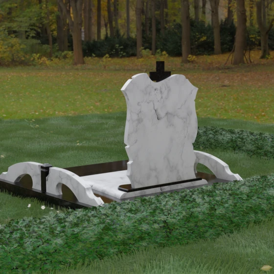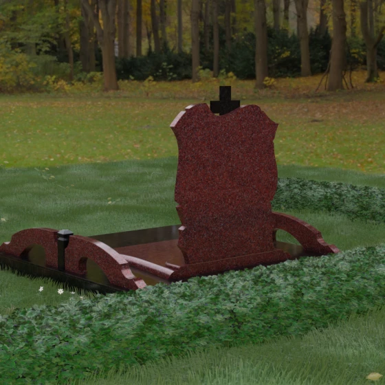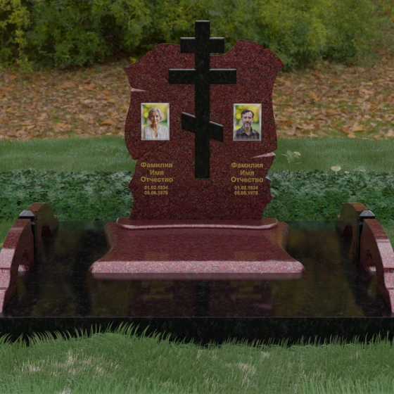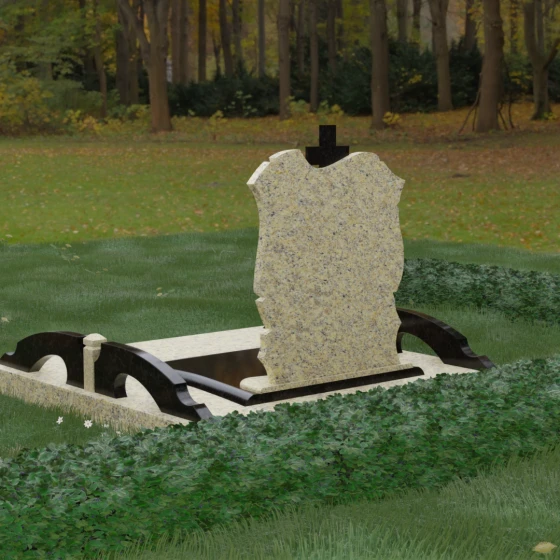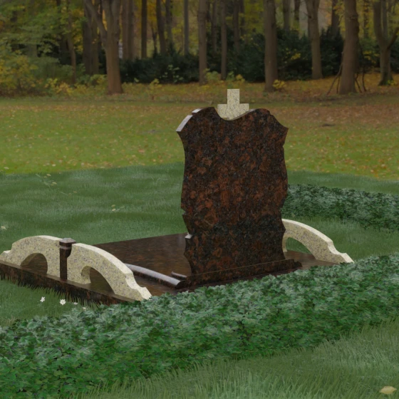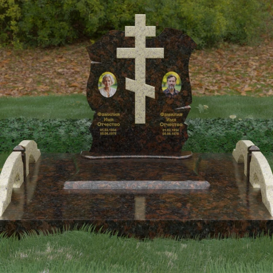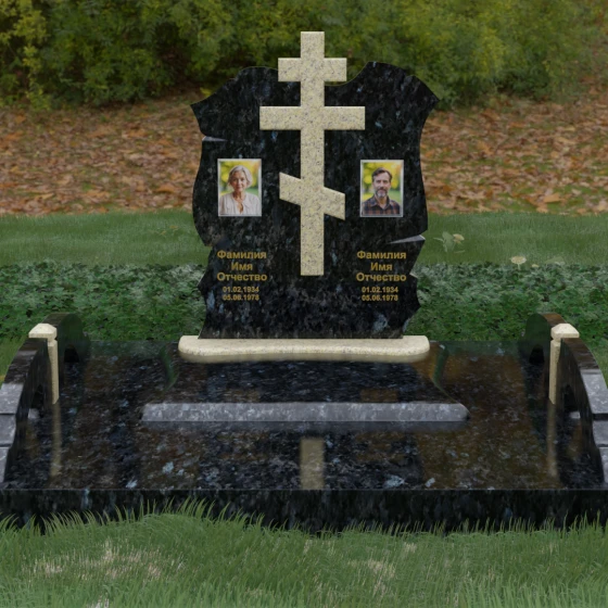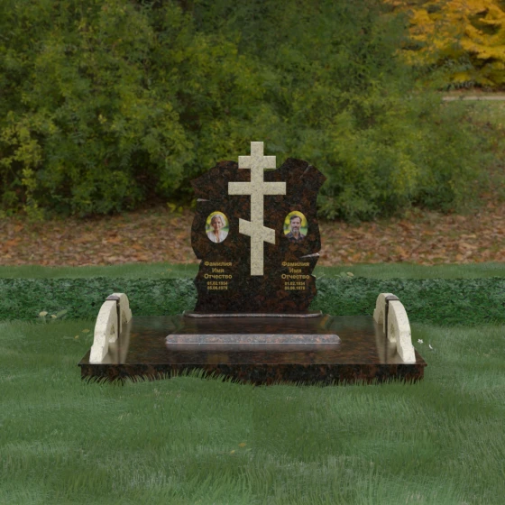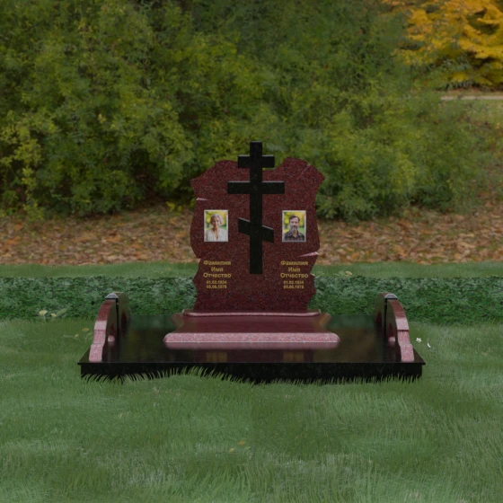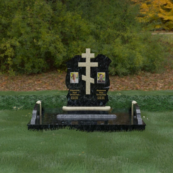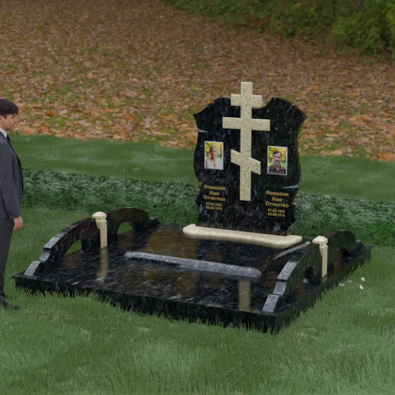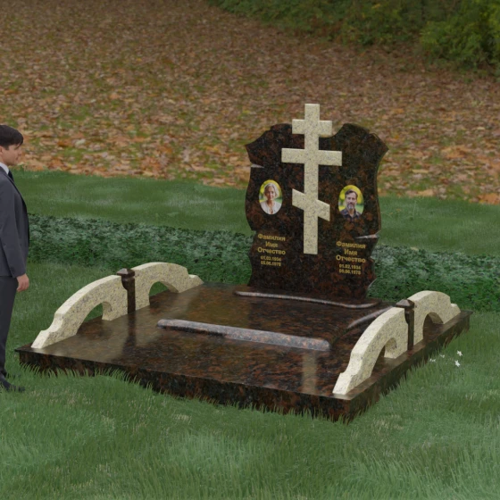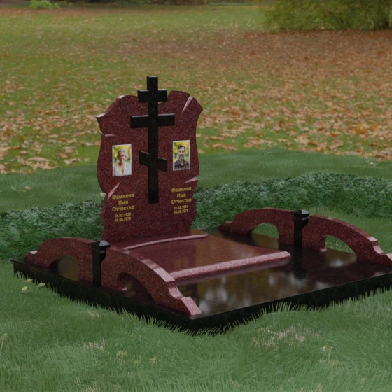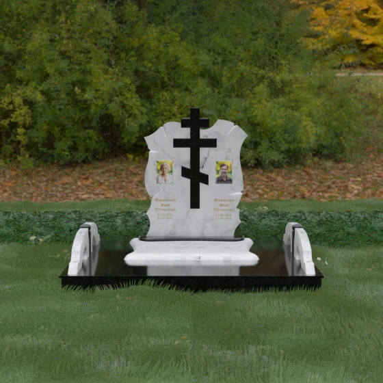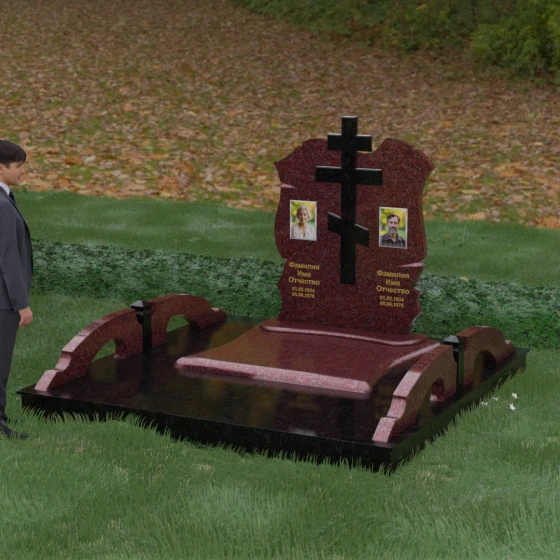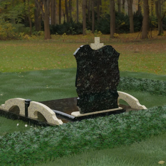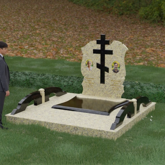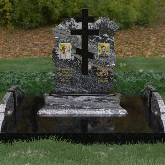 Конструкция продумана до мельчайших деталей, включая боковые декоративные элементы в виде изящных арок-«мостиков». Эти резные столбики с плавными изгибами соединяют стелу с границами участка, создавая ощущение защищенности и уединения. Они выполнены из того же светлого камня, что и центральный крест, создавая ритмичный цветовой контраст с темным основанием. Массивный цоколь придает всей конструкции устойчивость, визуально приподнимая мемориал над уровнем земли. На широкой горизонтальной стеле идеально располагаются два портрета, что делает эту модель безупречным выбором для семейного захоронения. Симметричное расположение медальонов и гравировок позволяет сохранить баланс и эстетическую целостность всей композиции, выделяя каждое имя.