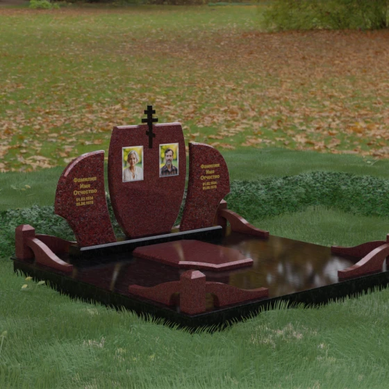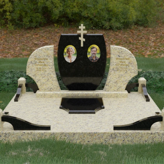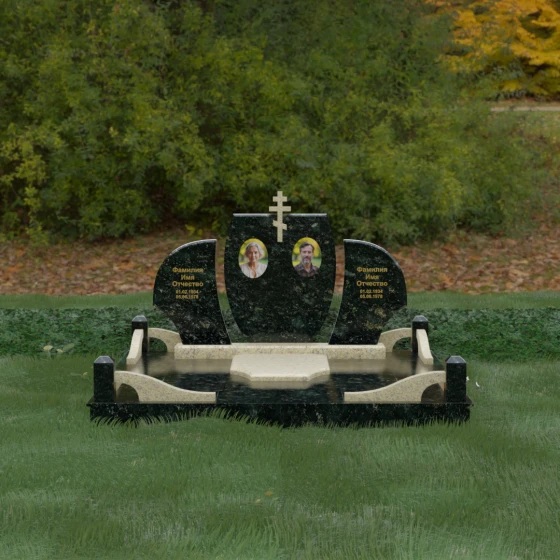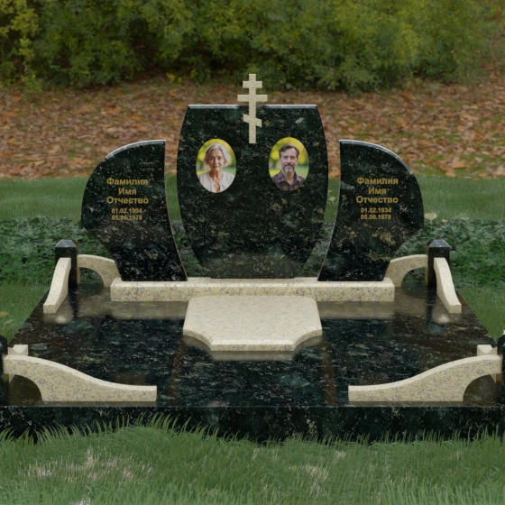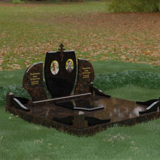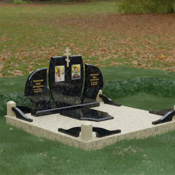 Оформление: для данной формы мы рекомендуем использовать технику глубокой гравировки ФИО с последующим нанесением сусального золота — это подчеркнет благородство темного камня. Овальные фотокерамические портреты идеально размещаются на центральной стеле, сохраняя композиционное равновесие, а золоченый крест визуально объединяет портреты в общую семейную историю.