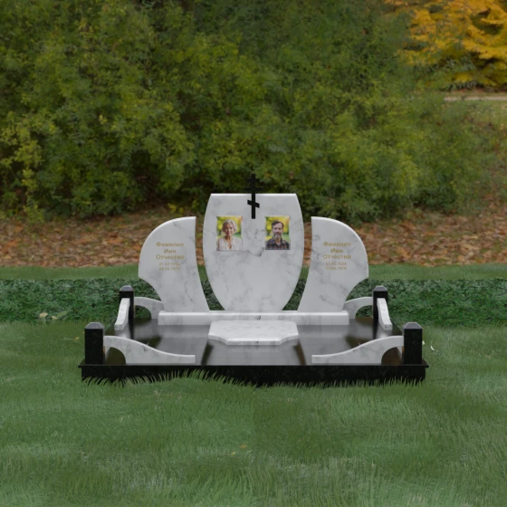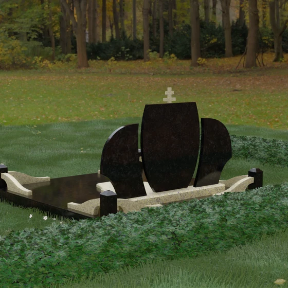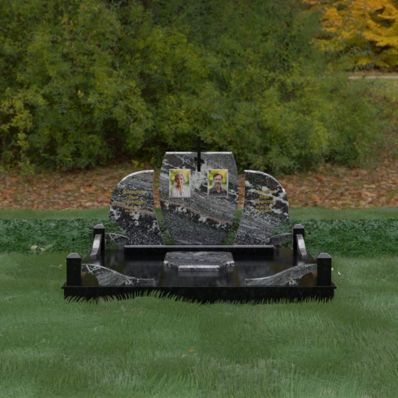 Данное ритуальное изделие представляет собой сложную архитектурную композицию, спроектированную по строгим законам симметрии и эстетического баланса. В центре ансамбля расположена доминирующая стела, чьи очертания напоминают одновременно и защитный щит, и лепестки раскрывающегося цветка. Венчает центральный элемент лаконичный восьмиконечный православный крест, выполненный в контрастном светлом оттенке, что делает его духовным ориентиром всей конструкции. Две боковые стелы, исполненные в форме изящных симметричных крыльев, плавно расширяются кверху, создавая гармоничный визуальный ритм и расширяя пространство для мемориальных надписей. Мастера уделили особое внимание филигранной обработке граней: зеркальная полировка основных плоскостей эффектно контрастирует с матовыми фасками, заставляя свет преломляться под разными углами и создавая глубокий эффект объема и трехмерности.