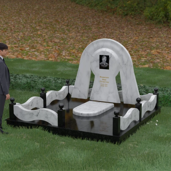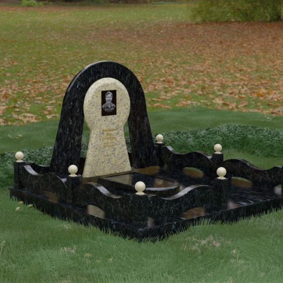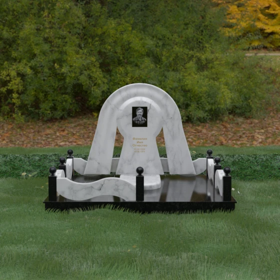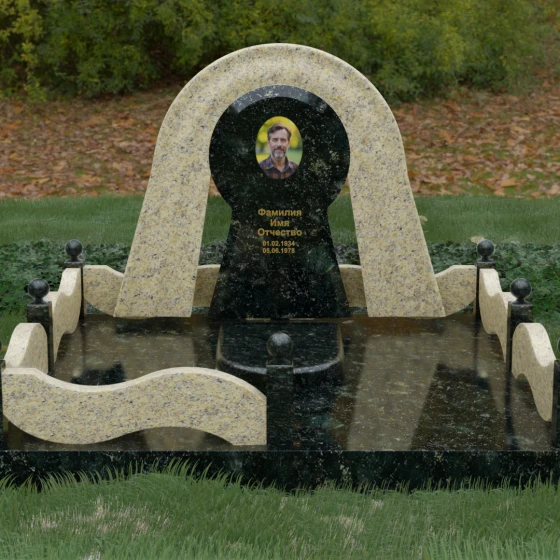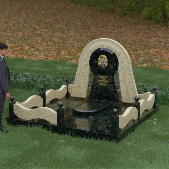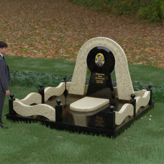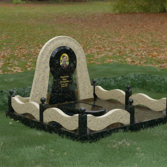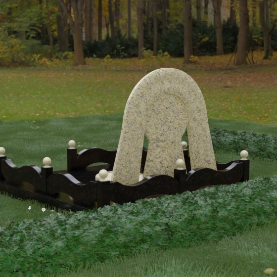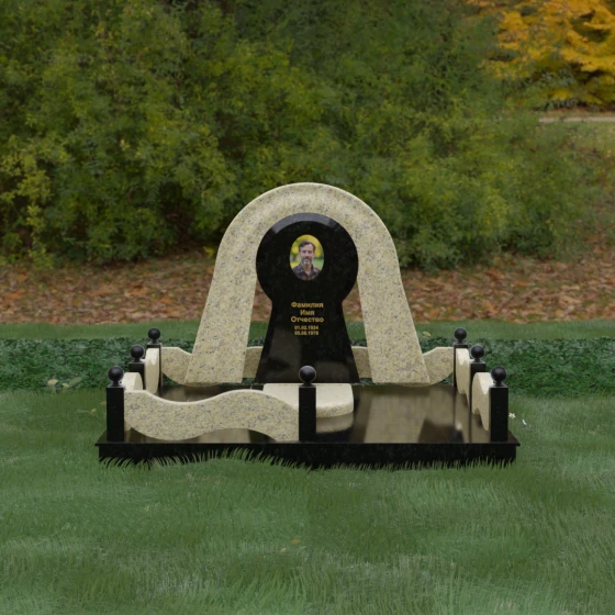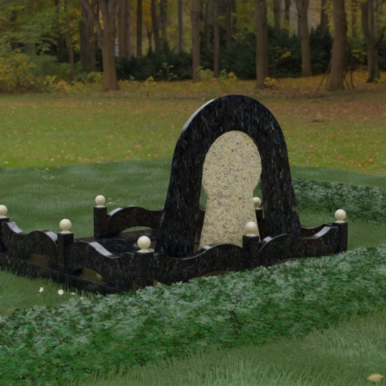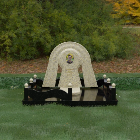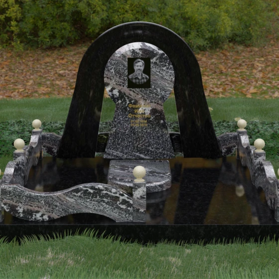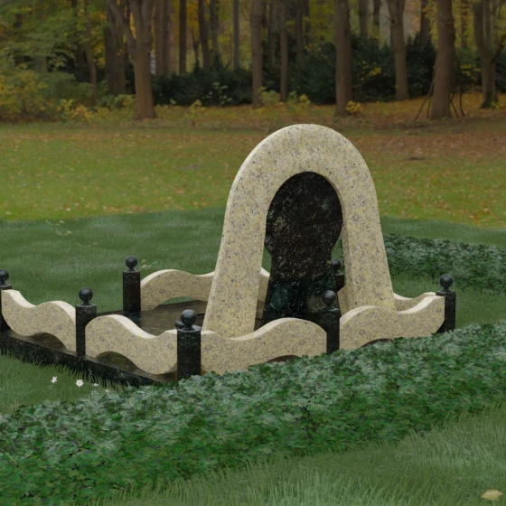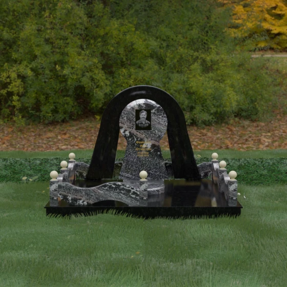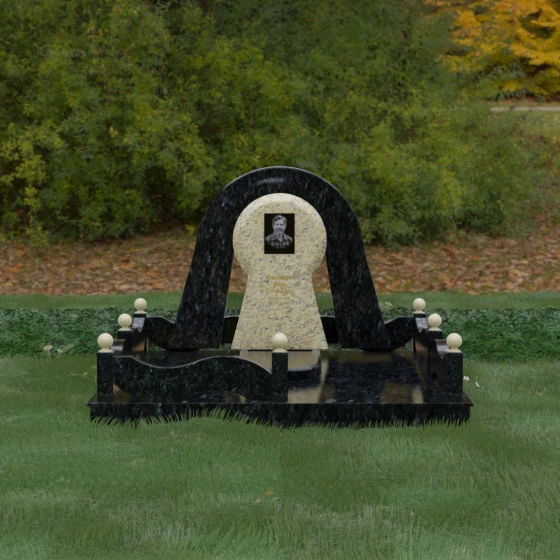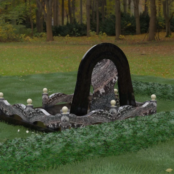 Данный мемориальный ансамбль представляет собой истинный триумф архитектурной мысли, воплощенный в камне. В центре композиции находится величественная стела, чей силуэт напоминает портал, соединяющий два мира. Геометрия изделия построена на изысканном контрасте форм: строгий черный монолит центральной части, имеющий идеальное круглое завершение, обрамлен массивной светлой аркой. Эта арка символизирует небесный свод и вечную защиту, окутывающую память об ушедшем человеке. Плавные изгибы внешнего контура гармонируют с мягкими волнами ограждения, создавая ощущение целостности и эстетического совершенства, которое не подвластно времени.