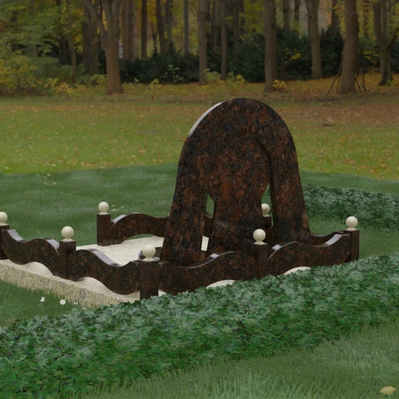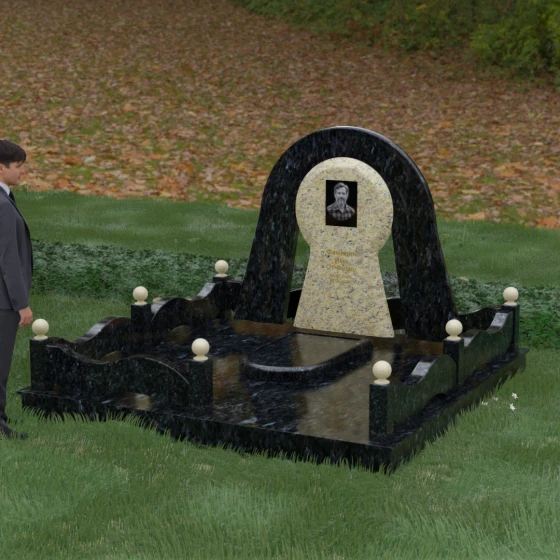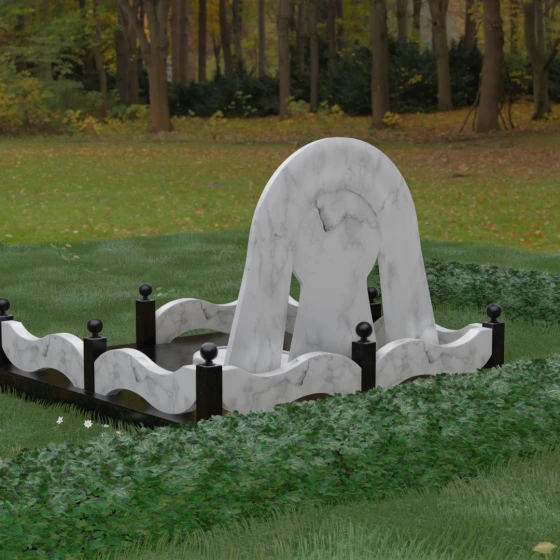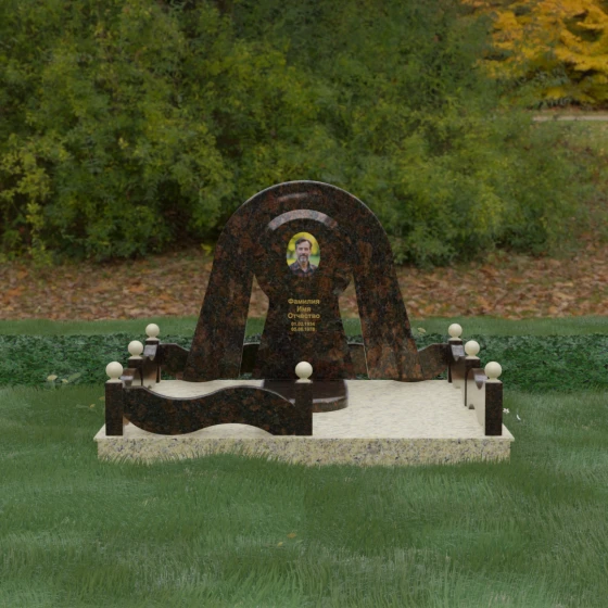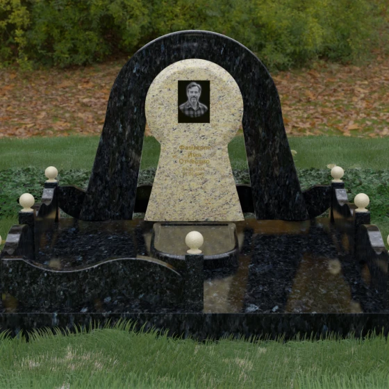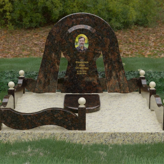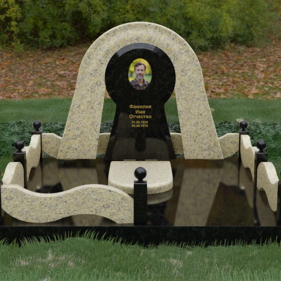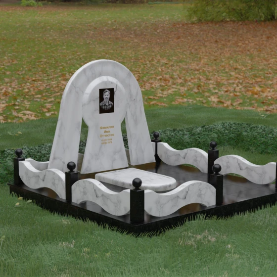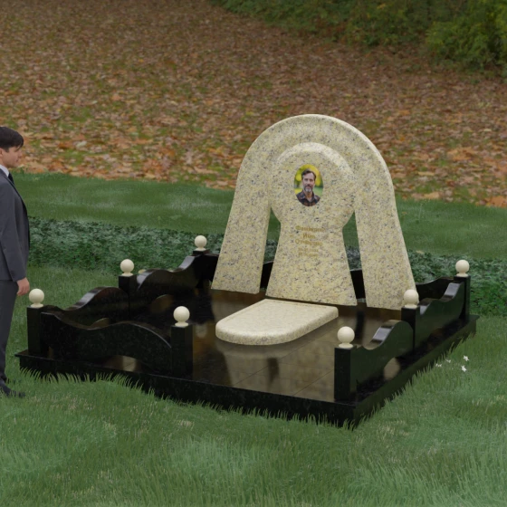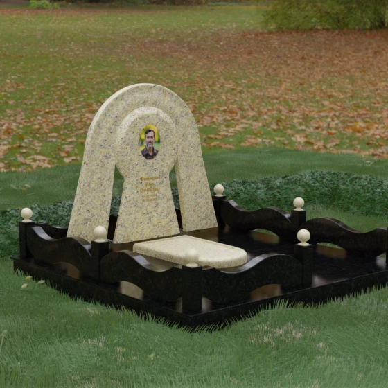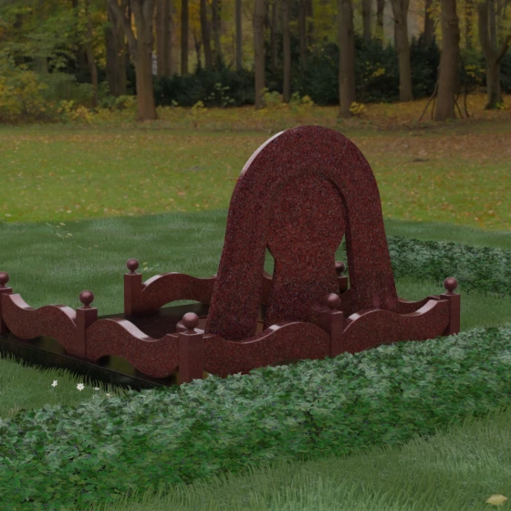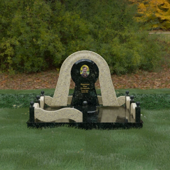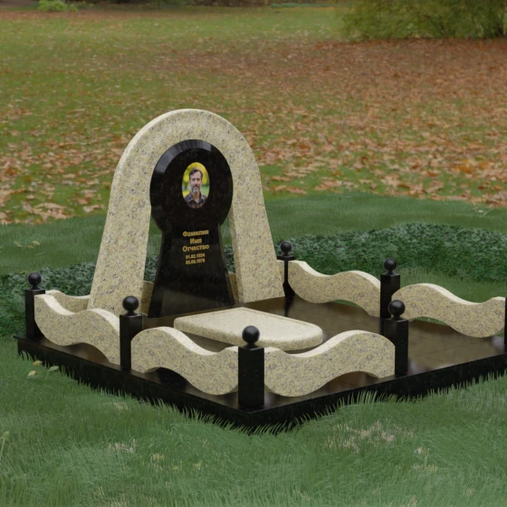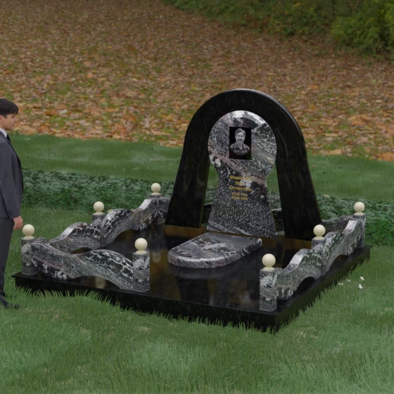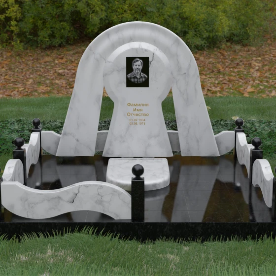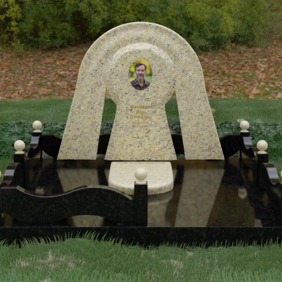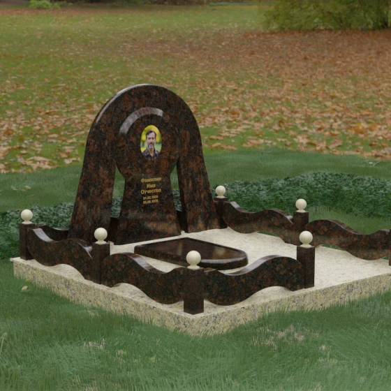 Данный мемориальный ансамбль представляет собой истинный триумф архитектурной мысли, воплощенный в камне. В центре композиции находится величественная стела, чей силуэт напоминает портал, соединяющий два мира. Геометрия изделия построена на изысканном контрасте форм: строгий черный монолит центральной части, имеющий идеальное круглое завершение, обрамлен массивной светлой аркой. Эта арка символизирует небесный свод и вечную защиту, окутывающую память об ушедшем человеке. Плавные изгибы внешнего контура гармонируют с мягкими волнами ограждения, создавая ощущение целостности и эстетического совершенства, которое не подвластно времени.