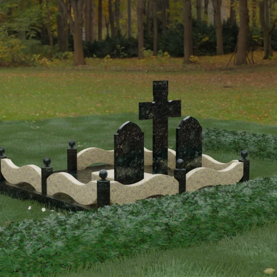 Эстетическая ценность этой модели заключается в безупречной игре контрастов. Глубокая зеркальная полировка темного камня эффектно подчеркивает светлые элементы благоустройства. Особое внимание привлекает ограждение участка: волнообразные резные панели из светлого гранита соединяют массивные столбики, увенчанные идеально отшлифованными каменными шарами. Это не просто памятник, а полноценный архитектурный комплекс, который выделяется на фоне стандартных решений своей статью и продуманностью каждой детали — от радиуса изгиба фасок до симметрии расположения всех элементов.