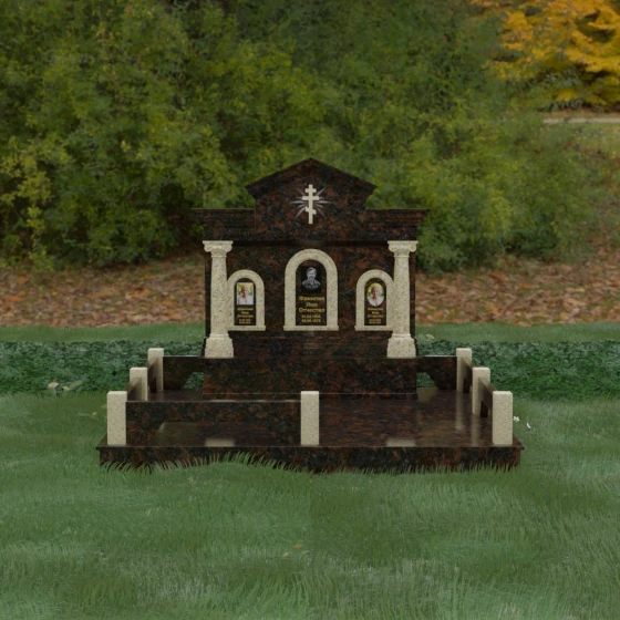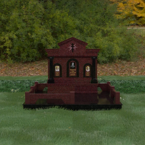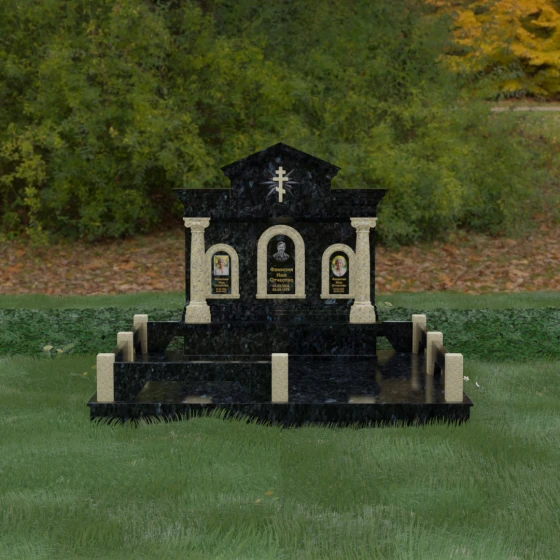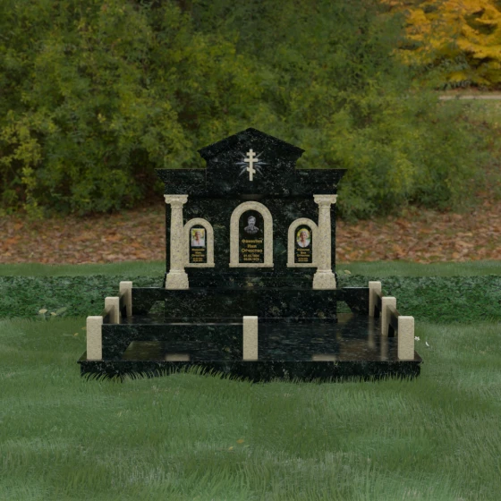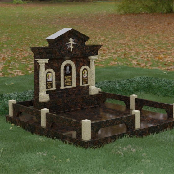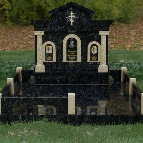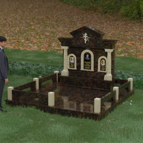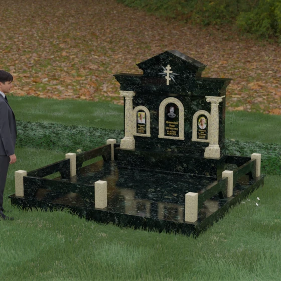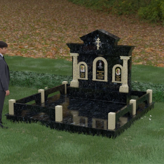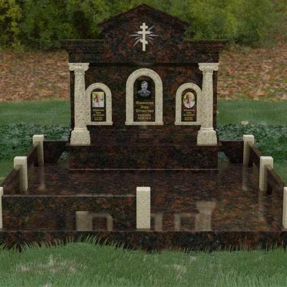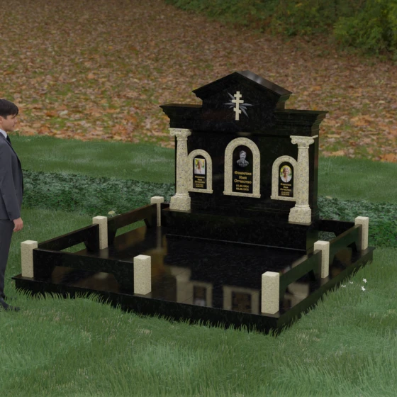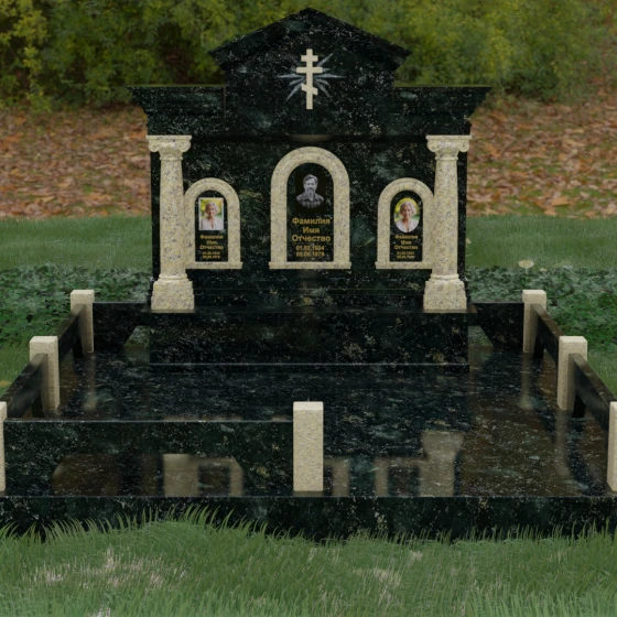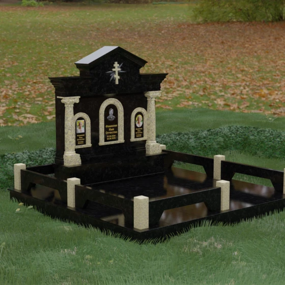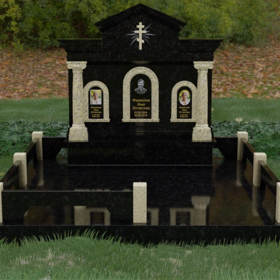 Представленный мемориальный ансамбль (Артикул 217) — это не просто памятник, а величественное архитектурное сооружение, выполненное в лучших традициях классицизма и храмового зодчества. Центральное место в композиции занимает массивная стела, разделенная на три смысловых сегмента, что делает её идеальным выбором для семейного захоронения. В центре возвышается триумфальная арка, обрамляющая главный портрет, а по бокам расположены симметричные ниши меньшего размера. Особую торжественность монументу придают изящные колонны с детализированными капителями, которые визуально поддерживают массивный фронтон. Венчает конструкцию строгий православный крест, выгравированный в верхней части — его лучи, расходящиеся в стороны, создают эффект сияния, искусно подчеркнутый игрой света на безупречно отполированной поверхности темного гранита.