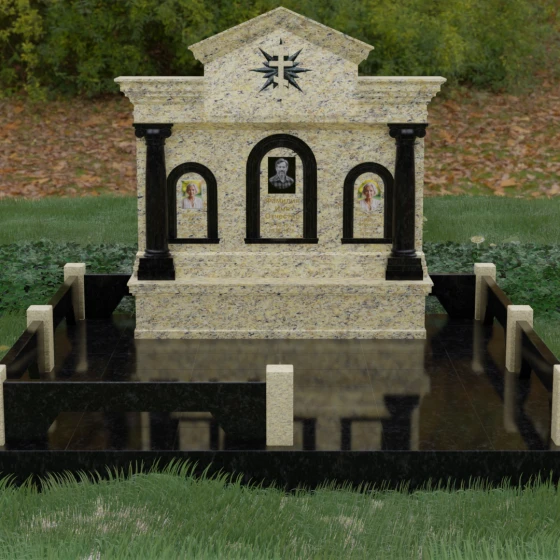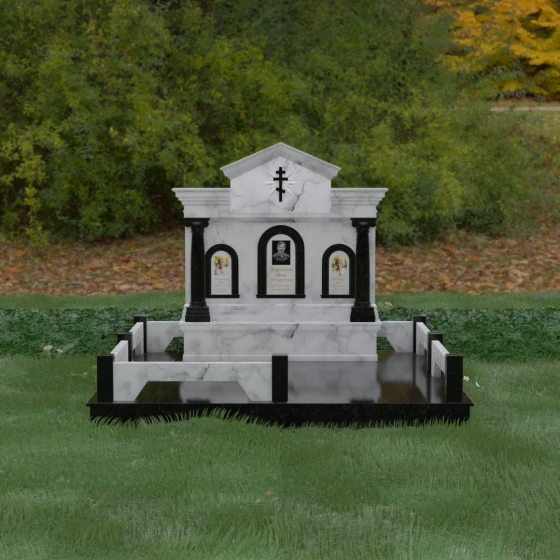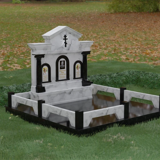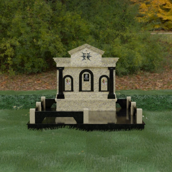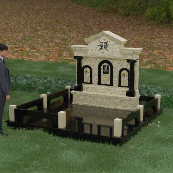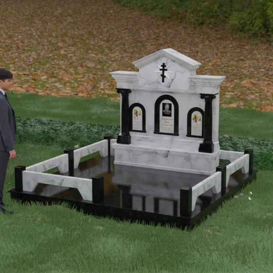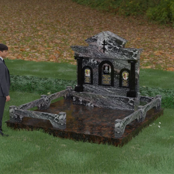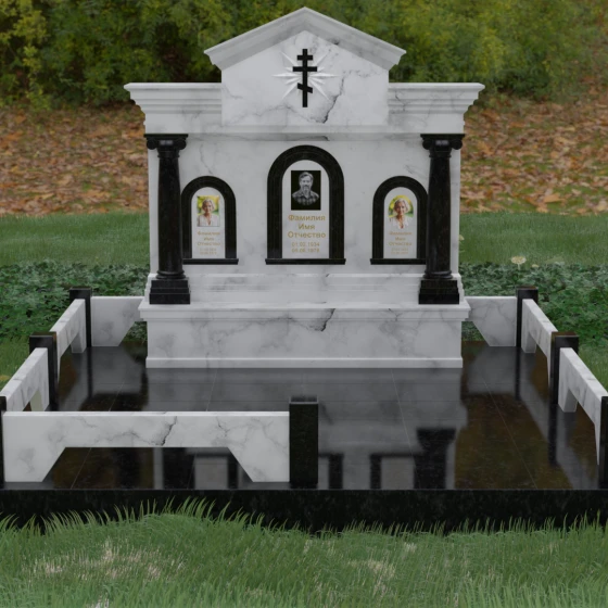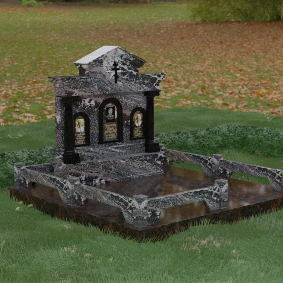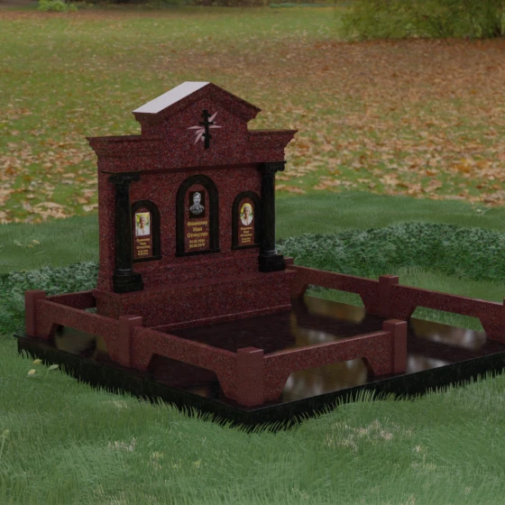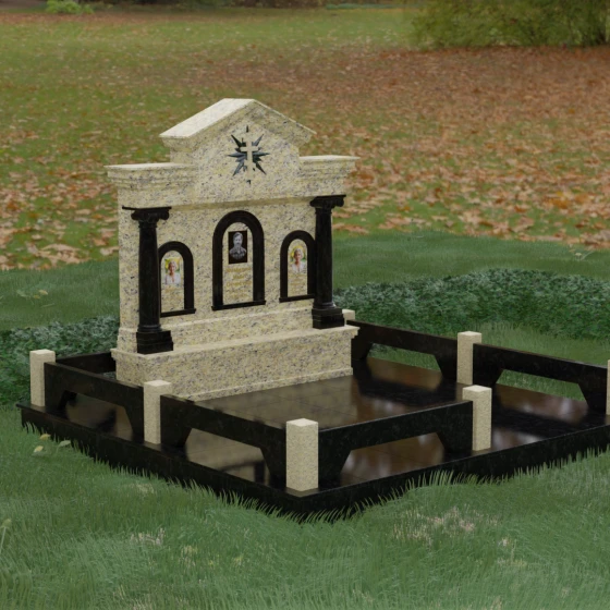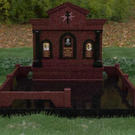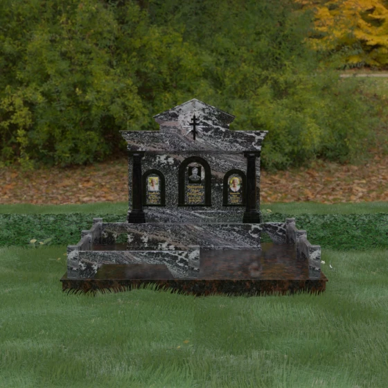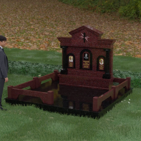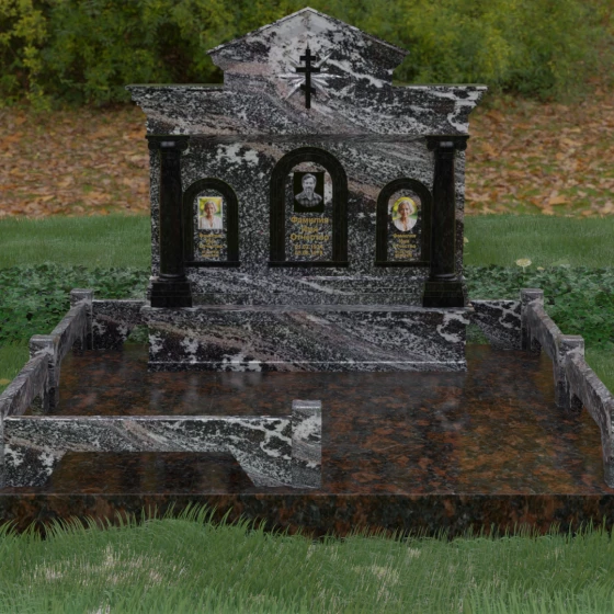 Представленный мемориальный ансамбль (Артикул 217) — это не просто памятник, а величественное архитектурное сооружение, выполненное в лучших традициях классицизма и храмового зодчества. Центральное место в композиции занимает массивная стела, разделенная на три смысловых сегмента, что делает её идеальным выбором для семейного захоронения. В центре возвышается триумфальная арка, обрамляющая главный портрет, а по бокам расположены симметричные ниши меньшего размера. Особую торжественность монументу придают изящные колонны с детализированными капителями, которые визуально поддерживают массивный фронтон. Венчает конструкцию строгий православный крест, выгравированный в верхней части — его лучи, расходящиеся в стороны, создают эффект сияния, искусно подчеркнутый игрой света на безупречно отполированной поверхности темного гранита.