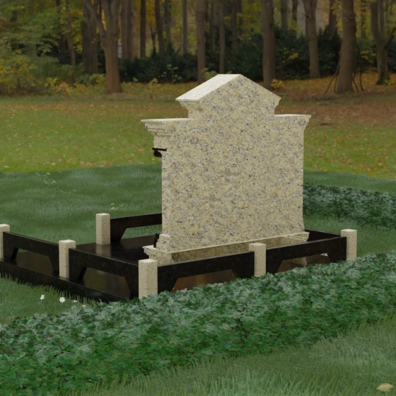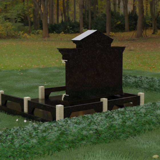 Оформление: Учитывая строгую геометрию и наличие арок, для данной модели рекомендуется использование керамических портретов или глубокой гравировки в центральных нишах. ФИО и даты жизни лучше всего располагать непосредственно под арками. Идеальным решением станет использование сусального золота или покрытия "античная бронза" для букв — это подчеркнет классический стиль колонн и придаст надписям объем, который будет эффектно играть в лучах заходящего солнца, создавая контраст с темным фоном стелы.