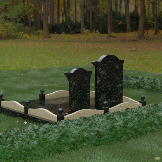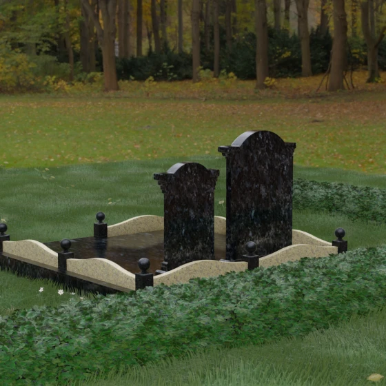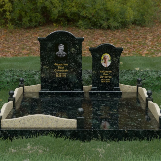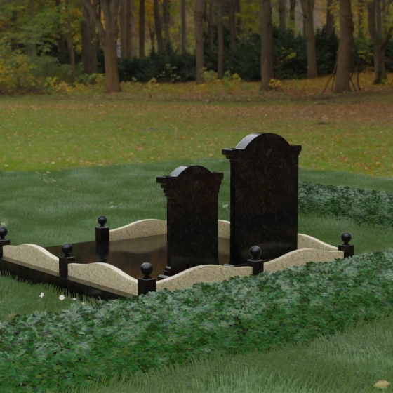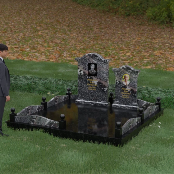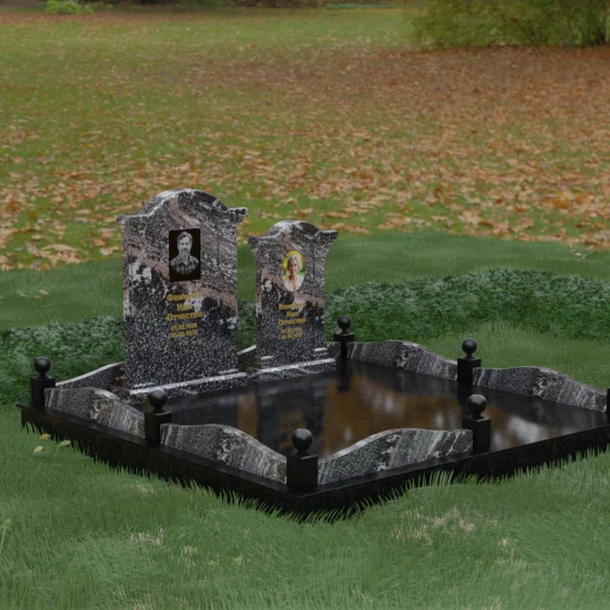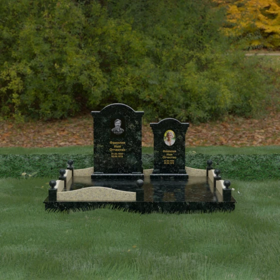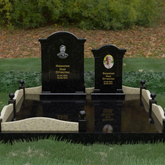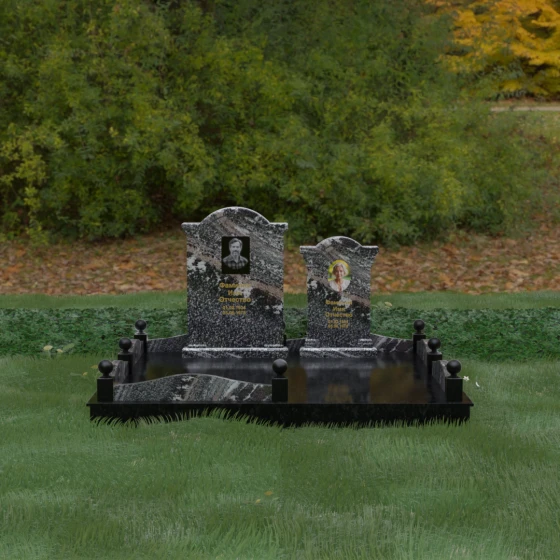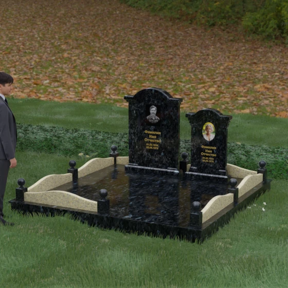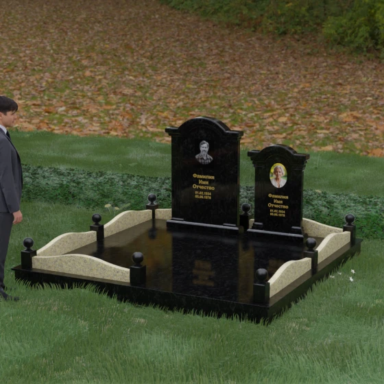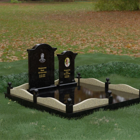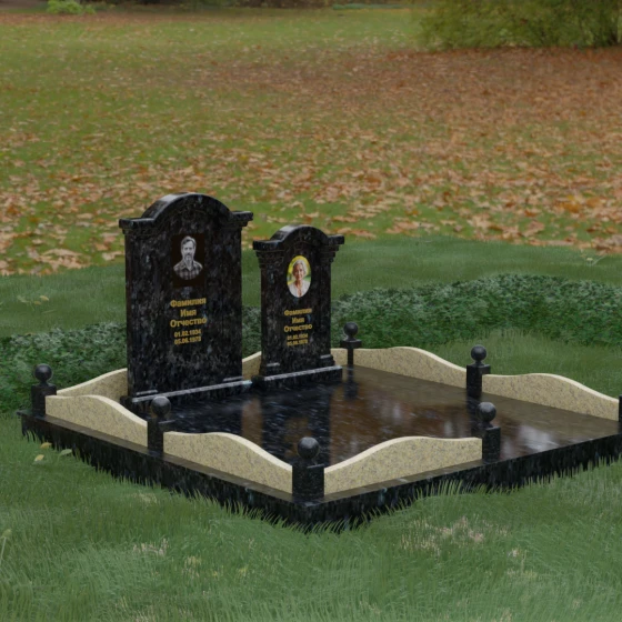 Данная модель выделяется своей монументальной и одновременно изящной архитектурой. В центре ансамбля расположены две вертикальные стелы разной высоты, объединенные общим стилистическим решением. Верхняя часть каждого обелиска увенчана сложным многоступенчатым навершием в форме мягкого купола с изысканными плечиками. Особое внимание стоит уделить обработке граней: глубокие фаски и филигранная полировка создают завораживающую игру света и тени. Зеркальная поверхность черного гранита отражает окружающий мир, визуально расширяя пространство, в то время как матовые переходы на резных элементах подчеркивают объем и благородство форм.