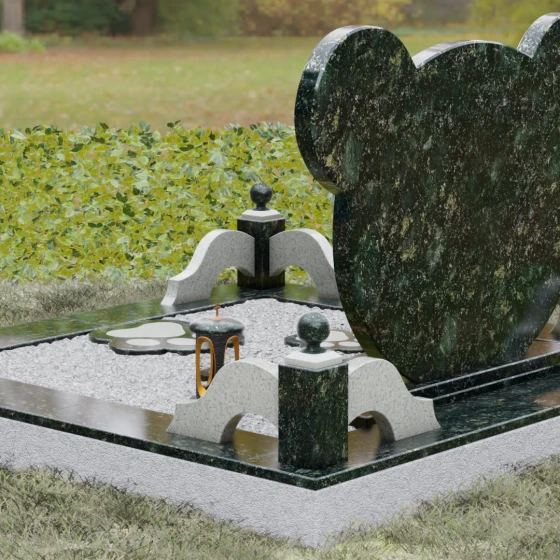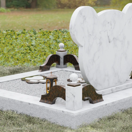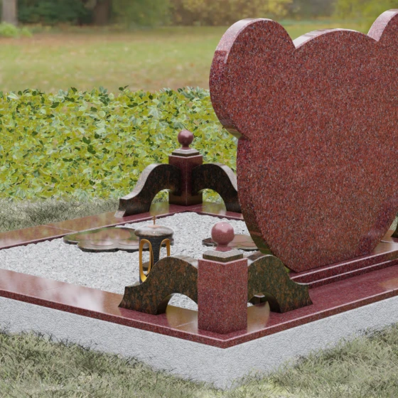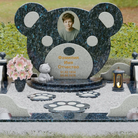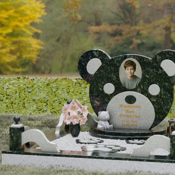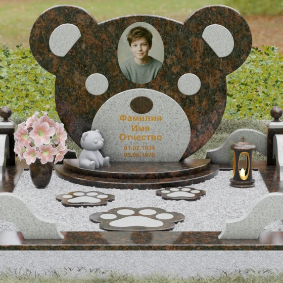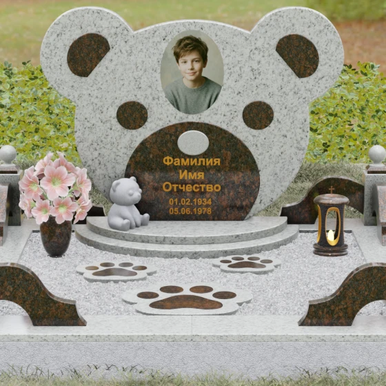 Эта мемориальная композиция представляет собой уникальный художественный проект, созданный для того, чтобы выразить бесконечную нежность и светлую печаль. Главная стела выполнена в форме головы медвежонка — символа чистоты, детства и вечного сна. Плавные, округлые линии силуэта лишены острых углов, что придает изделию визуальную мягкость и умиротворение. Мастера-камнерезы виртуозно передали геометрию образа: симметричные ушки со светлыми вставками и выразительные круглые глаза, созданные методом инкрустации камня другого оттенка. Игра контрастов между глубоким темным основанием и светлым матовым срезом декоративных элементов создает эффект живого объема, заставляя свет играть на полированных гранях и подчеркивая безупречную пластику камня.