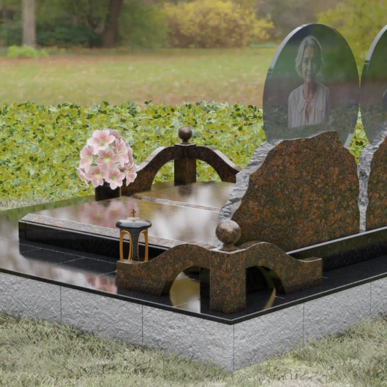 Данная мемориальная композиция представляет собой гармоничное сочетание природной силы и деликатной эстетики. В центре внимания — две величественные стелы, чьи навершия выполнены в форме идеальных полусфер, напоминающих заходящее солнце или две души, неразрывно связанные временем. Особое благородство этому изваянию придает контрастная обработка граней: если лицевая поверхность доведена до безупречного зеркального блеска, то боковые и нижние части камня оставлены в необработанном, "скальном" виде. Эта фактурная резьба, имитирующая естественный разлом горной породы, подчеркивает массивность и надежность конструкции, создавая ощущение вечности и непоколебимого покоя.