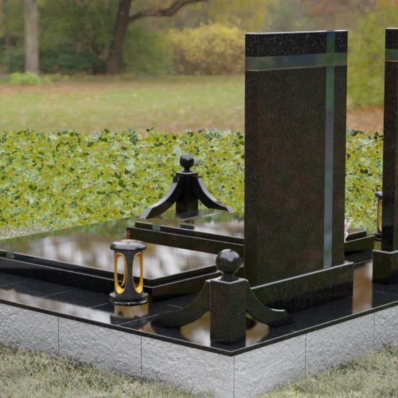 Данная величественная мемориальная композиция представляет собой не просто место упокоения, а подлинное произведение архитектурного искусства, призванное увековечить глубокую связь между двумя душами. Дизайн изделия строится на гармонии строгих вертикальных линий и изящных декоративных элементов, создавая атмосферу благородного спокойствия и вечного почтения. В центре ансамбля расположены две симметричные стелы, объединенные общим основанием, что символизирует неразрывность уз и жизненного пути, пройденного рука об руку. Особое внимание привлекает лаконичная резьба в верхней части плит: пересекающиеся глубокие борозды образуют строгий, геометрически выверенный крест. Этот символ веры и смирения не выступает отдельной деталью, а является неотъемлемой частью самого камня, подчеркивая монументальность и целостность всего надгробия.