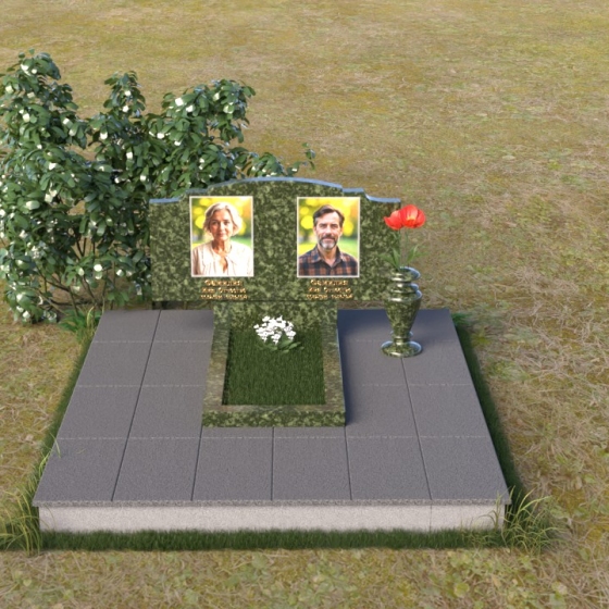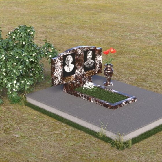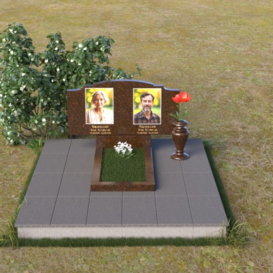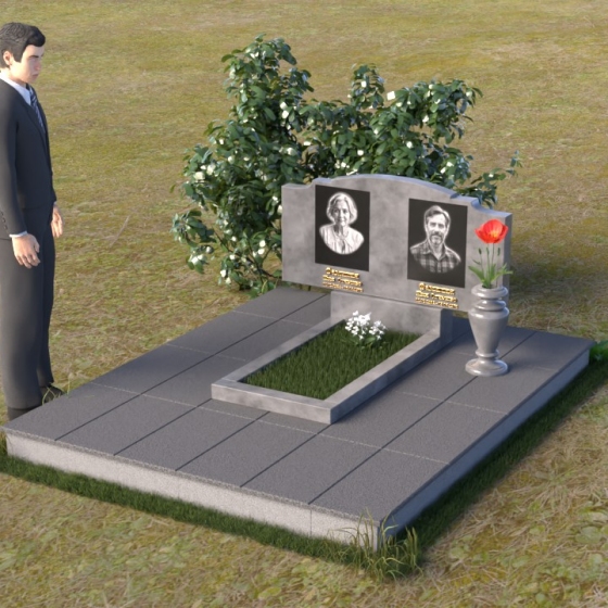 Этот гранитный монумент представляет собой композицию, где каждая деталь продумана до мелочей. Верхняя часть памятника имеет фигурную форму с плавными, волнообразными очертаниями, словно застывшая мелодия скорби. Верхний край обработан таким образом, что создает впечатление легкой, воздушной драпировки. Боковые грани аккуратно скруглены, смягчая строгость камня и придавая ему более изящный вид. Фаски, снятые по периметру, подчеркивают контур и добавляют выразительности. Лицевая поверхность отполирована до зеркального блеска, отражая свет и создавая ощущение глубины. На полированной поверхности выгравированы портреты усопших и памятные надписи, выполненные с особой тщательностью и вниманием к деталям. Под основной плитой располагается горизонтальная плита, также выполненная из черного гранита, создающая дополнительный уровень и подчеркивающая монументальность композиции. На ней размещена еще одна полированная плита, но уже меньшего размера, как символ нерушимости и продолжения рода.