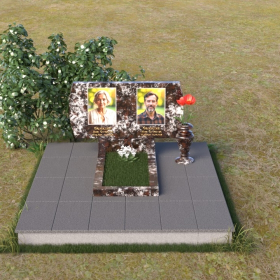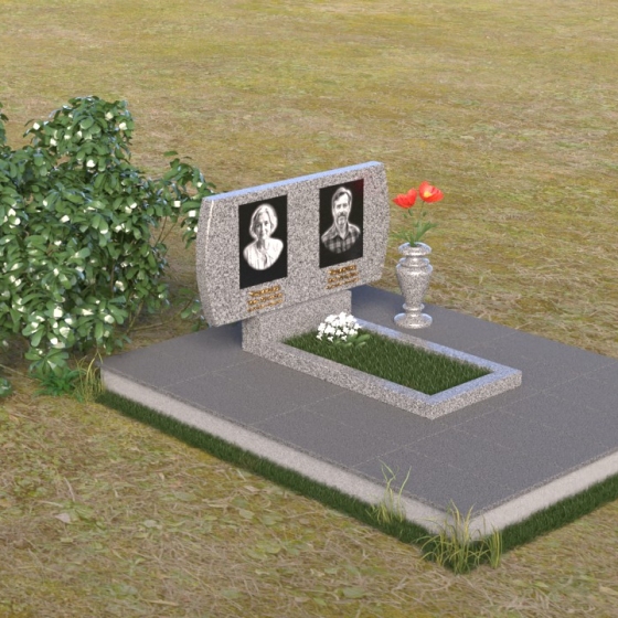 Композиция памятника строится на контрасте строгих геометрических форм и плавных линий, создавая гармоничный и запоминающийся образ. В верхней части возвышается стела из черного гранита, чья зеркальная полировка отражает небо и окружающий мир, словно напоминая о связи земного и небесного. Верхние углы стелы скруглены, смягчая строгость формы и придавая ей более мягкий, человечный облик. На стеле размещены портреты усопших, выполненные с высокой точностью и передающие их индивидуальность. Золотистые надписи имен и дат словно светятся на фоне черного камня, добавляя торжественности и значимости. У подножия стелы располагается горизонтальная плита, также выполненная из полированного черного гранита, создающая ощущение завершенности и устойчивости. Рядом – изящная ваза из того же материала, предназначенная для живых цветов, символа неувядающей памяти и любви.