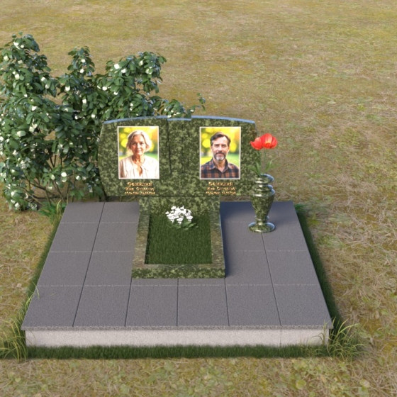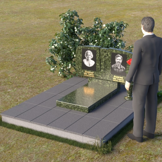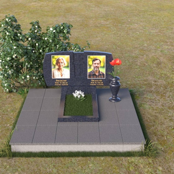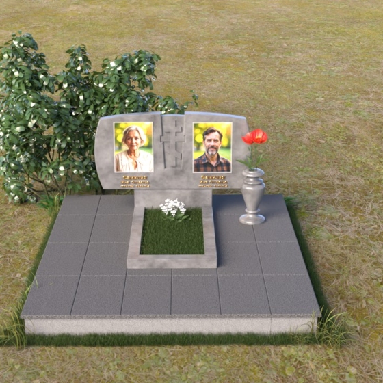 Геометрия модели тщательно продумана. Верхняя часть стел имеет скругленные углы, смягчающие строгость линий и придающие композиции более человечный облик. Между портретами выгравирован лаконичный православный крест, напоминающий о духовности и вере. Основание стел переходит в горизонтальную плиту, образуя единую плоскость с надгробной плитой. Надгробная плита выполнена в виде прямоугольника с полированной поверхностью, отражающей небо и окружающий мир. У основания композиции располагается аккуратная ваза из черного гранита, предназначенная для живых цветов, как символ непреходящей любви и уважения.
