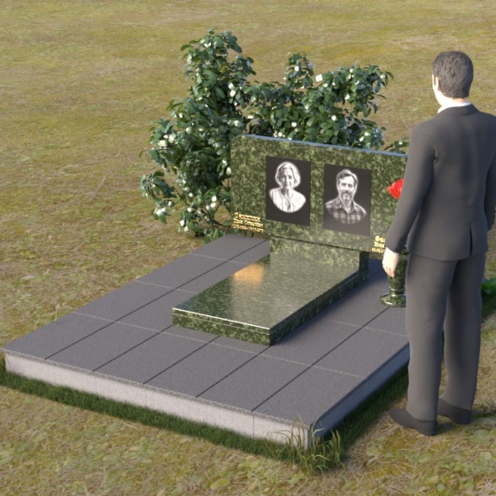 Форма стелы этого ритуального изделия идеально подходит для размещения двух портретов. Композиция с двумя изображениями, выполненными в технике гравировки, выглядит гармонично и сбалансированно. Под портретами можно расположить надпись с именем, датами жизни и короткой эпитафией. Золотое тиснение букв на черном граните создает эффект контраста и придает тексту дополнительную выразительность. Небольшая тумба, расположенная под стелой, служит подставкой для плиты с именами и годами жизни. Рядом с памятником можно установить вазу для цветов, выполненную в том же стиле и из того же материала, что и сам памятник. Это создаст единый ансамбль и подчеркнет целостность композиции. Дополнительно можно установить лампаду или небольшой фонарь, которые будут освещать памятник в темное время суток, создавая атмосферу умиротворения и светлой памяти.