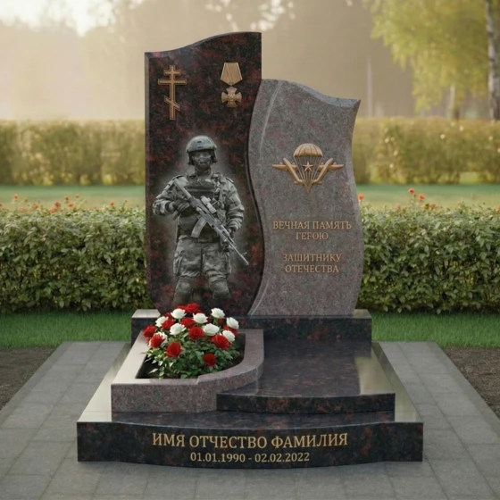 Правая стела, немного ниже и уже левой, имеет более динамичную, волнообразную форму. Ее верхняя часть плавно изгибается, создавая ощущение движения и легкости, несмотря на массивность камня. Лицевая сторона этой стелы также тщательно отполирована. В верхней части выгравирован символ Воздушно-десантных войск — парашют с крыльями, выполненный в золотистом цвете, что придает ему особую выразительность и значимость. Под ним располагаются проникновенные слова: "ВЕЧНАЯ ПАМЯТЬ ГЕРОЮ ЗАЩИТНИКУ ОТЕЧЕСТВА", выгравированные четким шрифтом, которые служат данью уважения и признательности. Боковые грани обеих стел имеют нежную, полуполированную обработку, которая мягко переходит в идеально отполированную лицевую часть, подчеркивая природную красоту камня и мастерство его обработки.