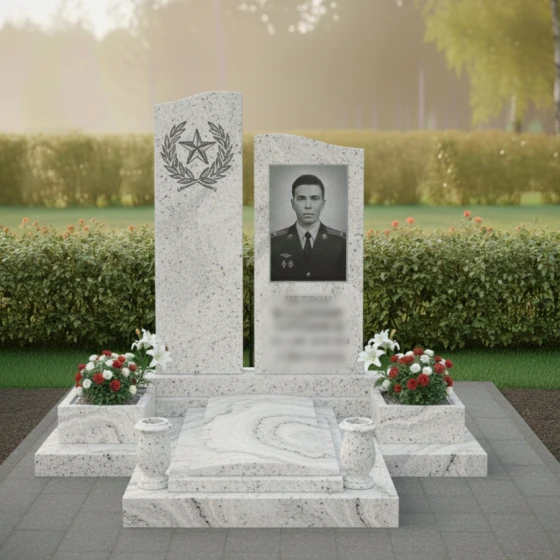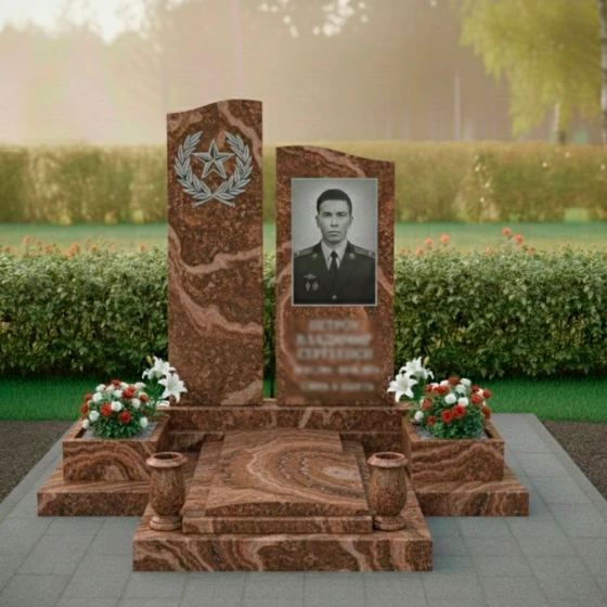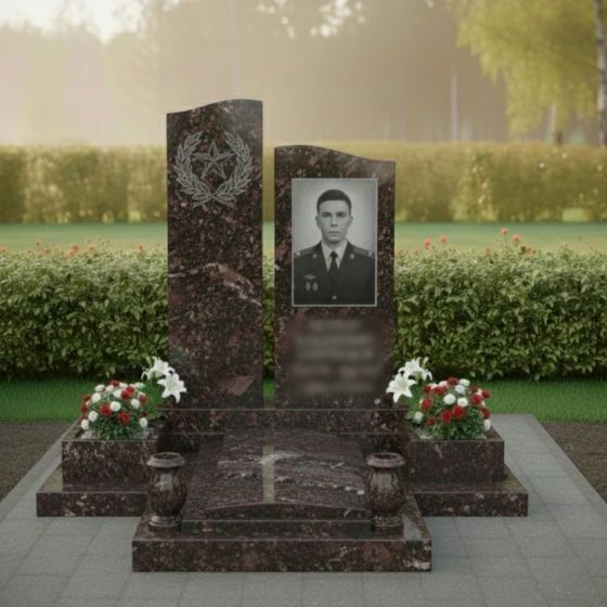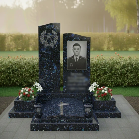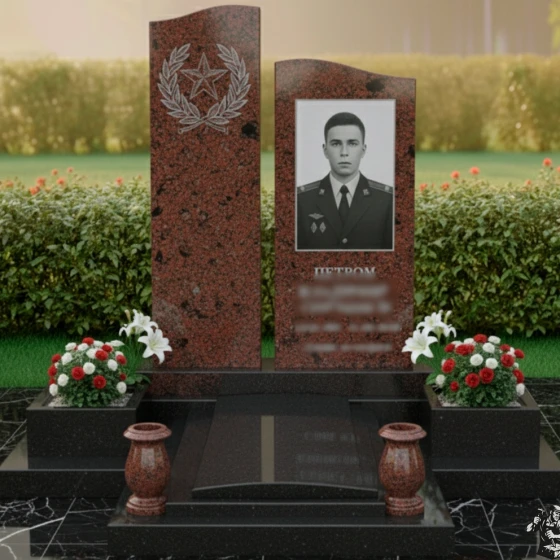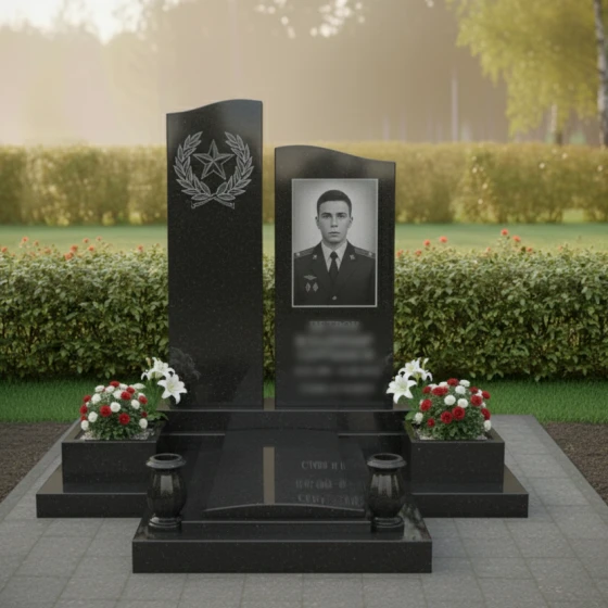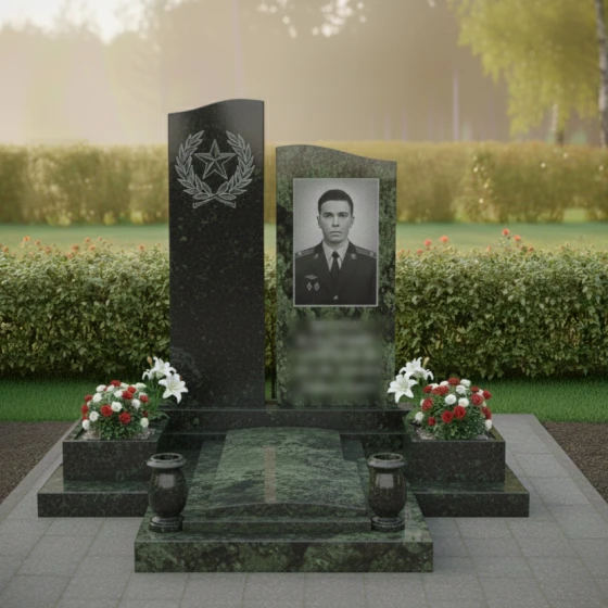 Мемориальная композиция, представленная моделью ПН 305, является воплощением глубокого уважения и вечной памяти. Это не просто надгробное сооружение, а подлинное произведение искусства, созданное для того, чтобы достойно увековечить образ ушедшего человека. Центральная часть композиции — две вертикальные стелы, каждая из которых обладает уникальной формой и символическим значением. Левая стела, более высокая и строгая, имеет плавную, волнообразную верхнюю грань, словно устремленную ввысь, к небесам. Ее безупречно отполированная до зеркального блеска черная поверхность служит идеальным фоном для тонкой гравировки, изображающей лавровый венок, обрамляющий пятиконечную звезду. Этот элемент придает композиции торжественность и символизирует доблесть и заслуги. Правая стела, чуть ниже, но не менее значимая, представляет собой строгий прямоугольник с идеально ровными, четко очерченными гранями. Ее лицевая сторона также обладает глубоким черным глянцем, создающим эффект бездонного пространства, на котором особенно выразительно смотрится портрет.