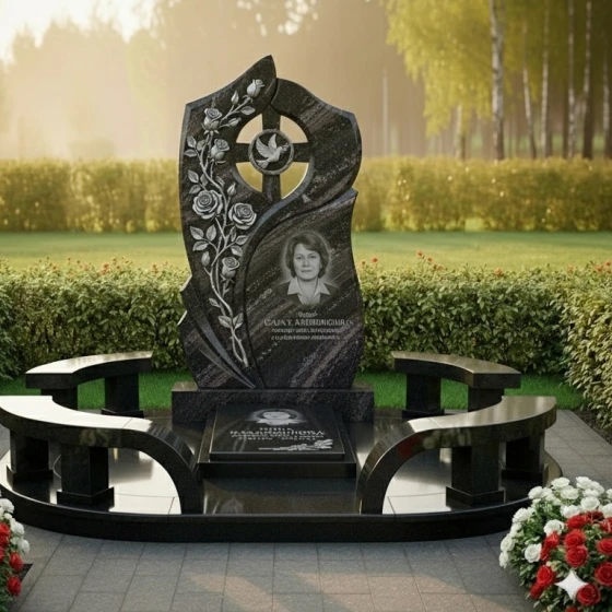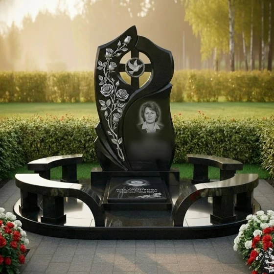 Гранит, из которого изготовлен данный мемориальный комплекс, является одним из самых долговечных и благородных материалов. Его высокая плотность обеспечивает исключительную прочность и устойчивость к механическим повреждениям. Гранит обладает превосходной морозостойкостью, что позволяет ему сохранять свой первозданный вид на протяжении многих десятилетий даже в условиях сурового климата. Зеркальная полировка поверхности камня не только придает изделию роскошный вид, но и делает его устойчивым к влаге и загрязнениям, значительно упрощая уход. Глубокий черный цвет гранита символизирует торжественность и вечную скорбь, а его способность отражать свет создает игру бликов, которая придает комплексу динамизм и глубину.