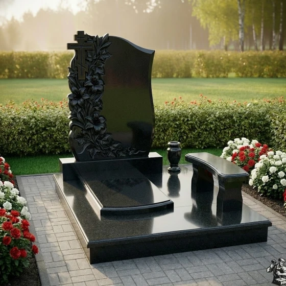 - Зеркальная полировка и фактура: Использование черного, зеркально отполированного гранита для основной поверхности стелы создает потрясающий контраст с матовыми, светло-серыми срезами камня на резных элементах. Это не только подчеркивает объемность резьбы, но и придает всему изделию выразительность, глубину и ощущение роскоши.