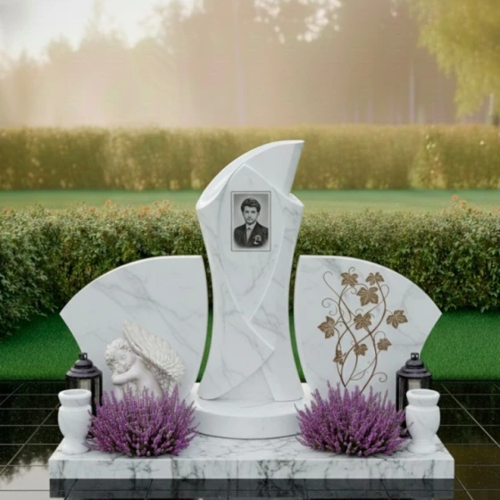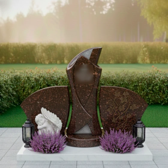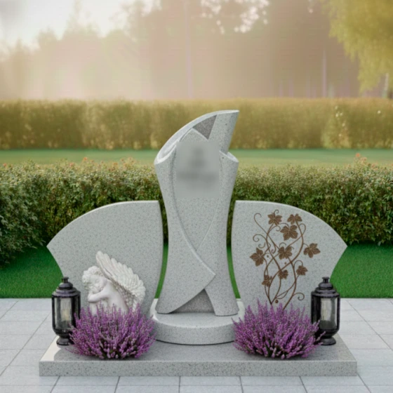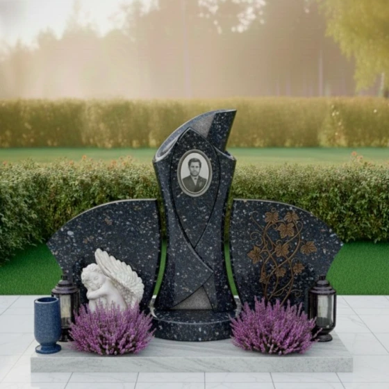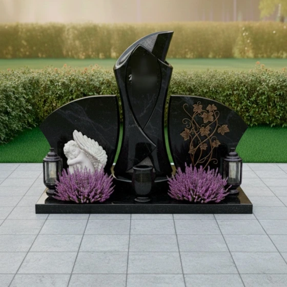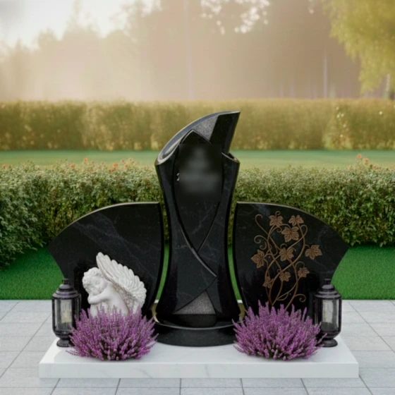 По обе стороны от центральной стелы расположены две изогнутые, словно крылья, плиты. Их верхние края выполнены в виде плавной, гармоничной волны, которая придает всей композиции легкость и изящество, несмотря на массивность камня. На левой плите, выполненной из светлого мрамора, покоится объемная скульптура ангела. Его крылья детально проработаны, каждое перышко вырезано с ювелирной точностью, создавая эффект воздушности и неземной красоты. Лик ангела обращен в сторону, выражая глубокое смирение и покой. Правая плита из черного гранита украшена изысканной гравировкой в виде виноградной лозы, которая плавно обвивает поверхность, символизируя жизненный цикл, плодородие и воскресение. Контраст между зеркальной полировкой черного гранита и светлыми, матовыми линиями гравировки создает потрясающий визуальный эффект, подчеркивая каждый изгиб и лист.