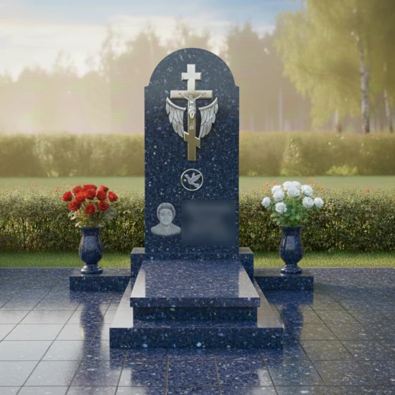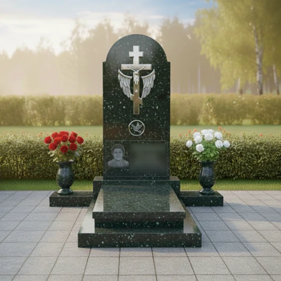 В центре верхней части стелы расположено рельефное изображение православного креста с распятием, выполненное с поразительной детализацией. Крест, являющийся символом веры и вечной жизни, окружен парой распахнутых ангельских крыльев, выполненных из светлого камня с матовой фактурой. Эти крылья, словно обнимающие крест, символизируют вознесение души и покровительство небесных сил, добавляя композиции ощущение легкости и духовности. Контраст между темным, глянцевым фоном и светлыми, объемными элементами резьбы создает эффект глубины и выразительности.