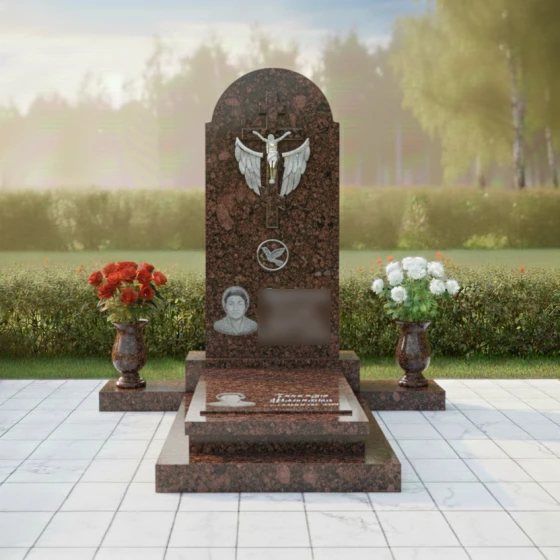 По бокам от стелы, на возвышениях цоколя, размещены две элегантные каменные вазы из черного полированного гранита. Их строгие, классические формы гармонично вписываются в общую композицию, предлагая место для живых цветов, которые станут символом не угасающей памяти и любви. Эти вазы, как и вся конструкция, выполнены с акцентом на прочность и долговечность, что является неотъемлемым качеством всех изделий из натурального камня.
