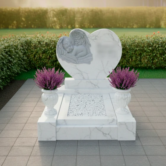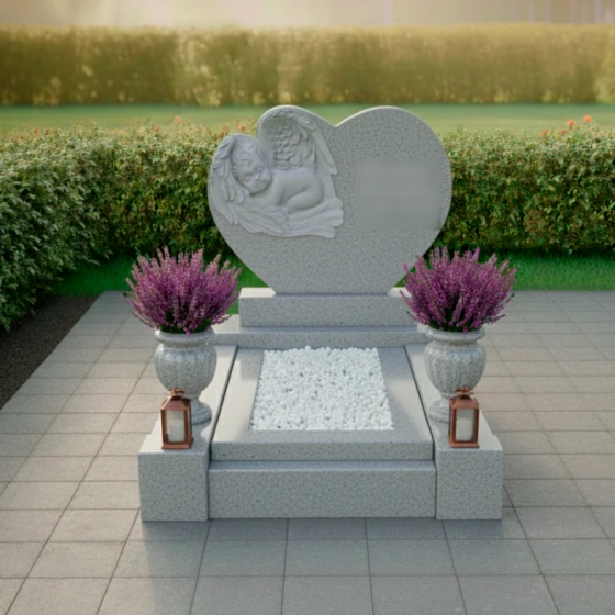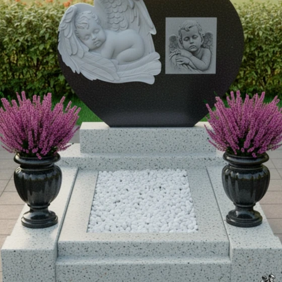 На левой стороне стелы расположен великолепный барельеф спящего ангела. Каждая деталь его фигуры — от пухлых щечек и нежных складок младенческого тела до искусно проработанных перьев на крыльях — выполнена с удивительной точностью и любовью. Ангел, погруженный в безмятежный сон, символизирует невинность, чистоту и вечный покой, а его распростертые крылья словно обнимают и защищают душу усопшего. Справа от барельефа, на отполированной поверхности, размещена гравировка еще одного ангела, чей задумчивый взгляд и легкая грусть в чертах лица передают глубокое чувство утраты, но при этом сохраняют надежду и светлую память. Эти два ангела, один объемный, другой гравированный, создают гармоничный диалог между материальным и духовным, между земным прощанием и небесным покоем.