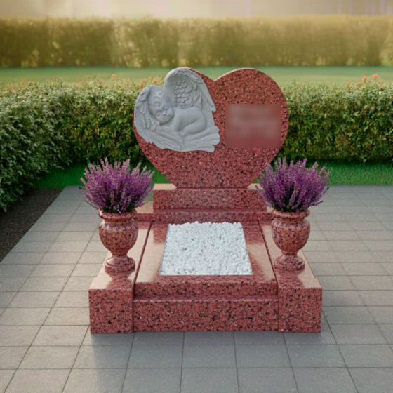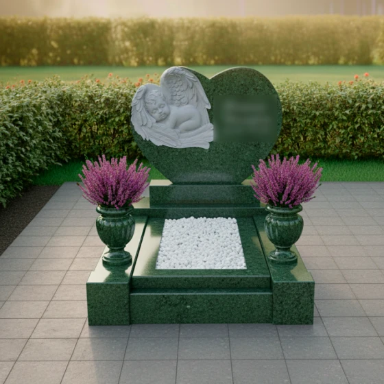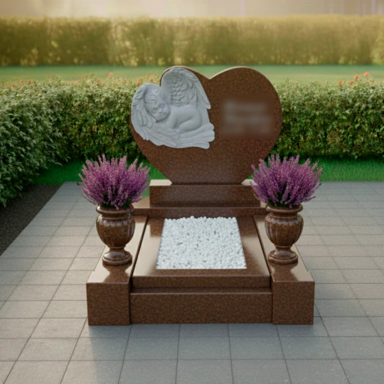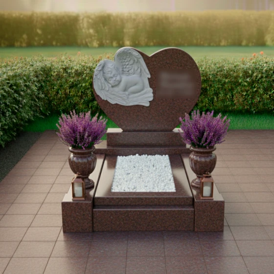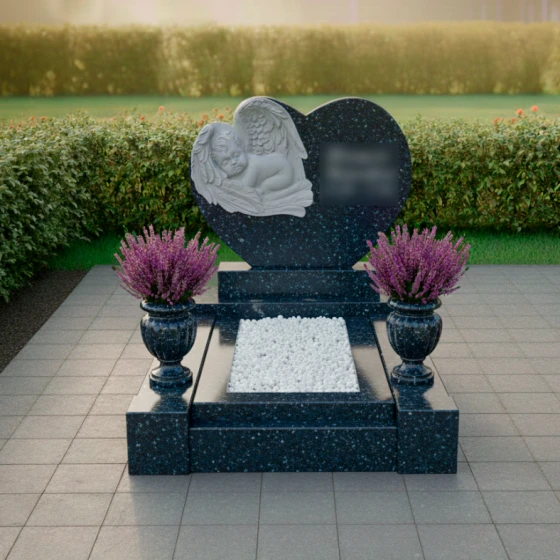Представляем вашему вниманию мемориальную композицию артикула ПН 418 — истинное произведение искусства, воплощающее нежность, скорбь и вечную любовь. Центральная стела выполнена в форме изящного сердца, символизирующего бесконечную привязанность и неугасающую память. Ее плавные, округлые линии не имеют острых углов, что создает ощущение мягкости, уюта и покоя, словно обнимая воспоминания о дорогом человеке. Зеркальная полировка черного гранита придает поверхности глубокий, отражающий блеск, который контрастирует с нежной, матовой фактурой резных элементов, подчеркивая их объем и художественную выразительность.