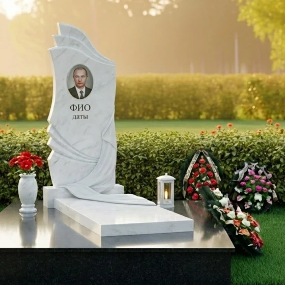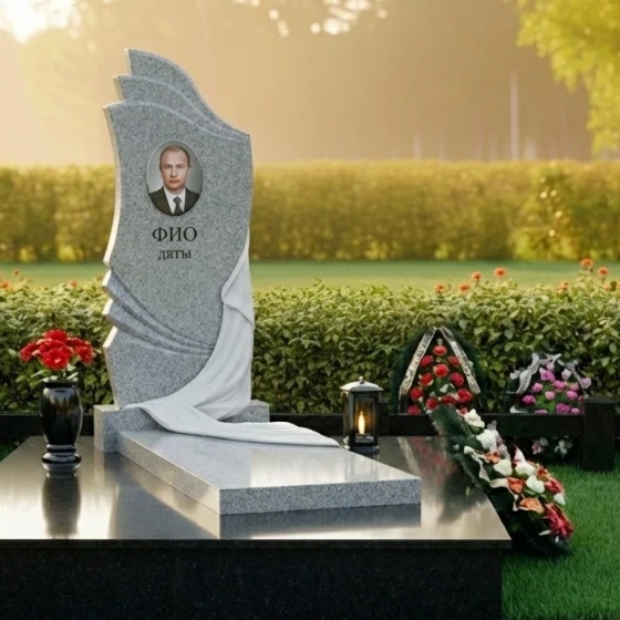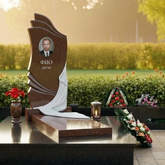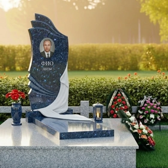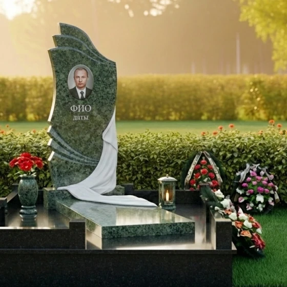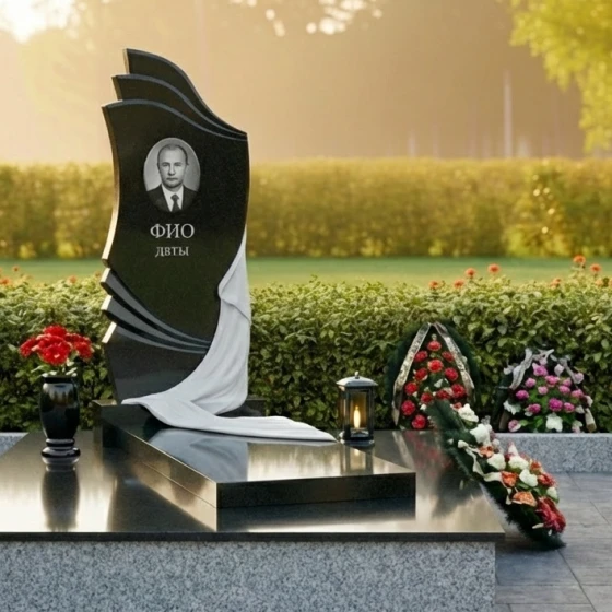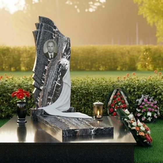 Геометрия стелы сверху донизу представляет собой сложную и глубоко символичную композицию. Верхняя часть стелы, словно возносящиеся к небесам волны или страницы открытой книги, выполнена с плавными, но при этом четкими изгибами. Эти формы придают изделию динамичность и легкость, несмотря на его внушительные размеры и вес. Центральная часть стелы оформлена как ниспадающая драпировка, искусно вырезанная из камня. Ее складки выглядят настолько реалистично, что создается впечатление, будто легкая ткань нежно обволакивает камень, символизируя прощание и покой. Игра контрастов здесь особенно выразительна: зеркально отполированная черная поверхность гранита, отражающая свет, противопоставляется матовым, бархатистым срезам камня на резьбе драпировки. Этот прием не только подчеркивает мастерство камнереза, но и придает изделию объем и глубину, заставляя его оживать под лучами солнца. В верхней части стелы расположена овальная гравировка для портрета, а ниже — место для имени и дат, выполненные с безупречной точностью.