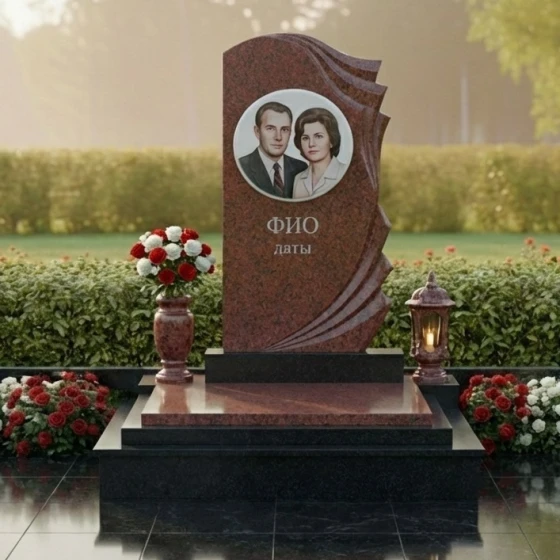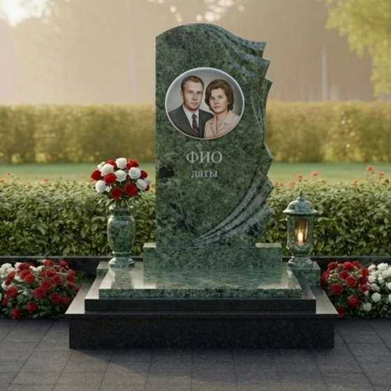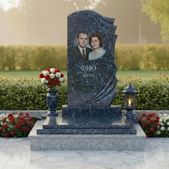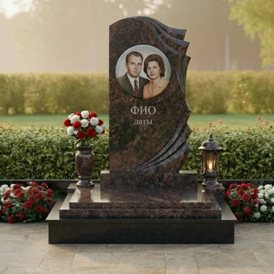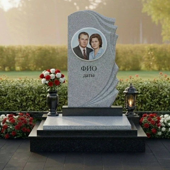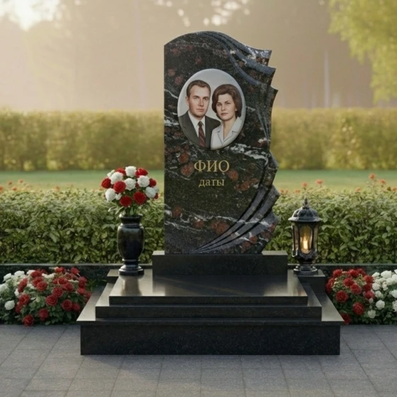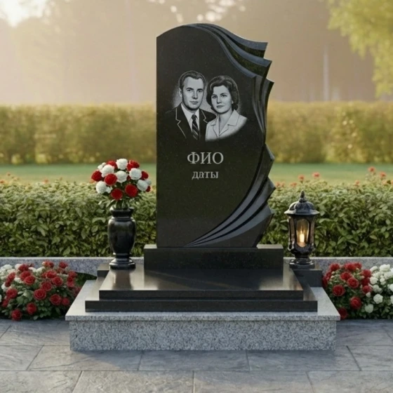 Уникальная форма этого монумента открывает широкие возможности для индивидуального оформления. На гладкой, зеркально отполированной поверхности основной части прекрасно разместится портрет усопшего, выполненный методом высокоточной гравировки. Благодаря идеальной плоскости и контрастному черному цвету, изображение будет выглядеть максимально четко и выразительно, передавая тончайшие черты лица и глубину взгляда. Ниже портрета предусмотрено место для нанесения имени, фамилии и дат жизни, которые будут выглядеть строго и элегантно. Дополнительные элементы, такие как эпитафии или символические изображения, могут быть размещены как на основной части, так и на изогнутых волнах, что позволит создать по-настоящему персонализированный и осмысленный мемориал.