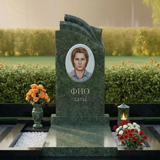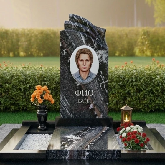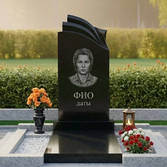 Центральный элемент композиции — массивная стела из отборного камня, чьи полированные поверхности отражают окружающий мир, словно зеркало, символизируя чистоту и ясность памяти. Верхняя часть стелы, выполненная в насыщенном черном цвете, имеет уникальную, волнообразную форму, напоминающую развевающееся знамя или страницы раскрытой книги, устремленные вверх. Эти плавные, но уверенные изгибы создают ощущение динамики и в то же время спокойствия, придавая изделию особую выразительность. Резные элементы верхней части стелы демонстрируют тонкую игру контрастов: идеально отполированная лицевая сторона переходит в матовые, шероховатые срезы камня по бокам, подчеркивая глубину и фактуру материала.