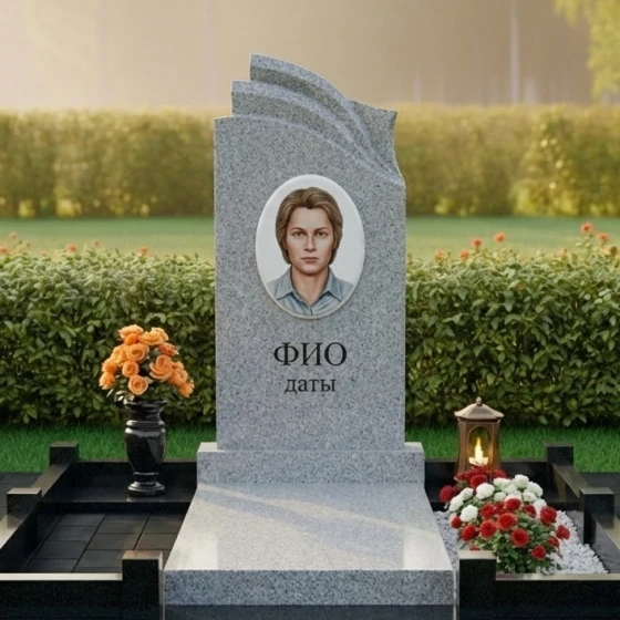 Оформление: Для данной формы стелы мы рекомендуем гравировку портрета в овальной или прямоугольной рамке, расположенной в верхней части. Это позволит сохранить центральную композицию и не перегрузить пространство. ФИО и даты жизни лучше разместить под портретом, используя классический шрифт, который будет хорошо читаться на полированной поверхности камня. Возможно также добавление небольшого эпитафийного текста или символического изображения (например, голубя или ветви), которые подчеркнут индивидуальность усопшего и усилят эмоциональное воздействие ритуального изделия.