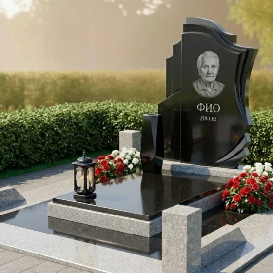 Центральным элементом композиции является величественная стела, выполненная в глубоком черном цвете, который символизирует вечность и непреходящую скорбь. Ее форма представляет собой асимметричный силуэт, напоминающий раскрытую книгу или же, возможно, распахнутые крылья, готовые унести душу ввысь. Верхняя часть стелы имеет изящный, волнообразный срез, который добавляет динамики и легкости, смягчая общую монументальность. Особенно примечательна полировка камня: зеркальная поверхность идеально отражает свет, создавая ощущение глубины и благородства. Внутри этой черной глади, будто из тумана, проступает светлое, матовое изображение портрета, выполненное в технике гравировки. Эта игра контрастов между глянцевой чернотой и нежным матовым рисунком придает стеле особую выразительность и подчеркивает индивидуальность увековеченной памяти. Гравировка ФИО и дат жизни, выполненная строгим, но элегантным шрифтом, органично вписывается в общую композицию, не нарушая ее гармонии.
