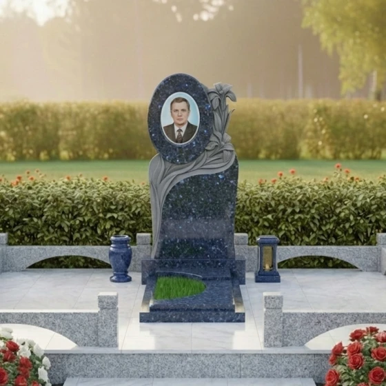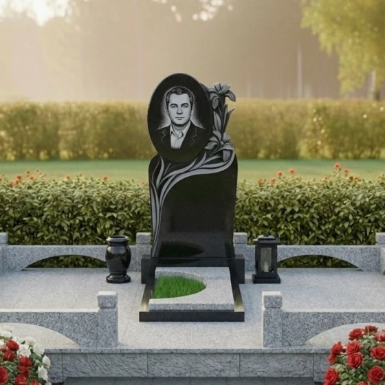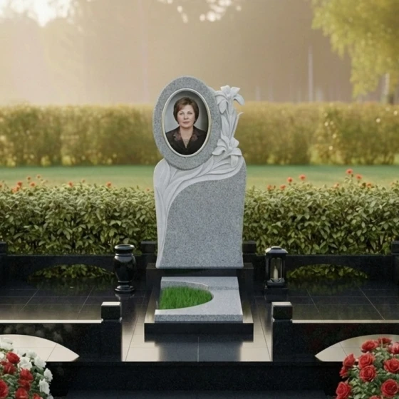 Величественная стела данного ансамбля притягивает взгляд своей сложной, асимметричной геометрией. В верхней части композиции доминирует идеально выверенный овал, предназначенный для размещения портрета, который словно обрамлен самим камнем. Особого внимания заслуживает художественная резьба: по правому краю мемориала ниспадает пышное соцветие лилий. Мастер-камнерез детально проработал каждый лепесток, создавая объемный барельеф, который кажется живым благодаря игре света. Лилии символизируют чистоту и вечный покой, а их плавные изгибы плавно перетекают в волнообразные линии, окаймляющие нижнюю часть плиты.