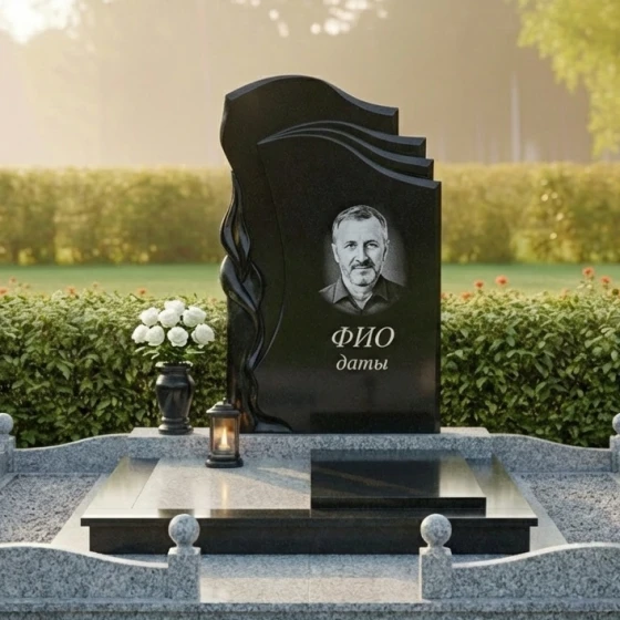 Модель ПН 466 представляет собой уникальное сочетание строгой элегантности и мягких, обволакивающих линий, создающих ощущение защищенности и гармонии. Центральная стела выполнена из высококачественного гранита глубокого черного цвета, который благодаря зеркальной полировке приобретает невероятную глубину и отражает окружающий мир, создавая игру света и тени. Верхняя часть стелы асимметрична, с правой стороны она поднимается вверх, завершаясь плавным изгибом, напоминающим легкий взмах или развевающуюся ткань. Левая грань стелы имеет более сложную, многослойную форму с выраженными рельефными элементами, которые добавляют объёма и динамики. Эти волнообразные, полированные грани создают эффект движения, словно шепот ветра или легкое прикосновение. Контраст между идеально гладкой, зеркальной поверхностью и матовыми, слегка шероховатыми срезами на резных элементах подчеркивает благородство камня и мастерство исполнения.