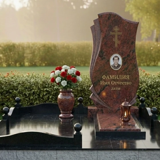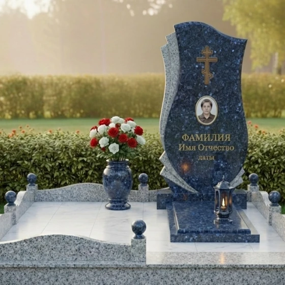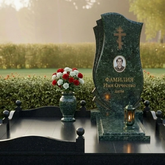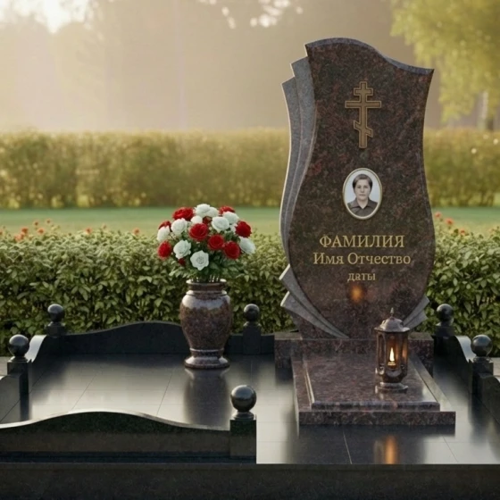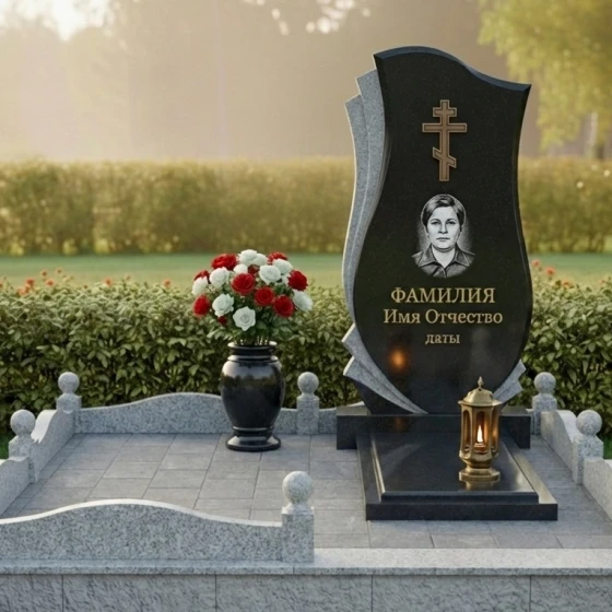Оформление: Форма стелы ПН 471 с ее плавной волной и скошенной гранью предоставляет широкие возможности для художественного оформления. На идеально отполированной черной поверхности гранита наилучшим образом будет смотреться гравировка портрета, выполненная с высокой детализацией, передающей малейшие нюансы выражения лица. Контраст светлого изображения на темном фоне создаст эффект монументальности и выразительности. ФИО и даты жизни, выгравированные классическим шрифтом, будут легко читаемы и гармонично впишутся в общую композицию, не перегружая ее. Дополнительные элементы, такие как эпитафии или символические изображения, могут быть размещены в нижней части стелы или на надгробной плите, дополняя основной смысл мемориала.