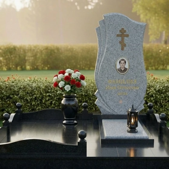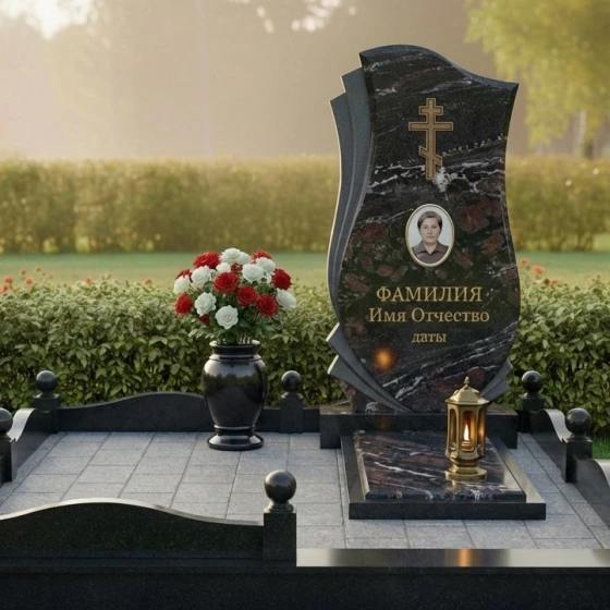 Представляем вашему вниманию мемориальный комплекс ПН 471 – надгробие из натурального камня, воплощающее в себе грацию линий и монументальную надежность, призванную увековечить память о близком человеке. Этот проект – результат гармоничного сочетания традиционных форм и современных архитектурных решений, где каждая деталь продумана до мелочей. Центральная стела, выполненная из глубокого черного гранита, притягивает взгляд своей динамичной, но в то же время плавной формой. Ее верхний край искусно изогнут, создавая эффект легкой волны, которая поднимается к небесам, символизируя переход души в иной мир. Одна из граней стелы имеет скос, подчеркивающий объем и придающий композиции выразительность. В центральной части стелы, на зеркально отполированной поверхности, выгравирован классический православный крест, лаконичный и строгий, без распятия, что придает ему универсальность и благородство. Ниже располагается поле для портрета и данных усопшего. Игра контрастов между идеально гладкой, отражающей свет поверхностью основной стелы и более светлыми, матовыми торцами резьбовых элементов создает эффект глубины и рельефа, подчеркивая мастерство обработки камня.