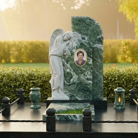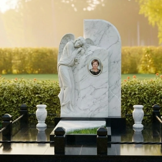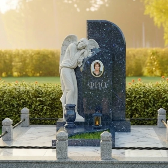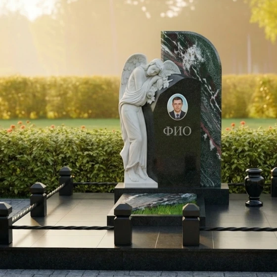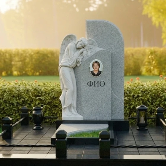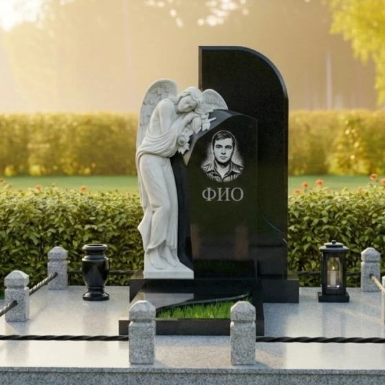 Величественная стела этой модели притягивает взгляд своей уникальной асимметричной формой. Ее правая грань представляет собой строгий, вертикальный срез, подчеркивающий монументальность и непоколебимость памяти. В то же время, левая часть стелы плавно изгибается, образуя изящную арку, которая обнимает собой центральную часть, создавая ощущение защиты и умиротворения. Этот контраст между прямолинейностью и мягкими изгибами придает композиции динамичность и глубокий смысл. Все видимые полированные поверхности стелы имеют глубокий черный, зеркальный блеск, отражающий свет и создающий эффект бесконечной глубины. На этом фоне особенно выразительно смотрится портрет усопшего, выполненный методом гравировки, который благодаря контрасту света и тени становится почти объемным. Фаски по периметру стелы четко очерчены, подчеркивая ее форму и придавая ей законченный вид. Особое внимание привлекает объемная фигура скорбящего ангела, выполненная из светлого камня с матовой, бархатистой фактурой. Ангел, склонившийся в глубокой печали, будто обнимает стелу, его крылья мягко опущены, а драпировка его одежд передана с поразительной детализацией. Каждая складка, каждый изгиб ткани выполнены с ювелирной точностью, создавая ощущение легкости и воздушности, несмотря на монолитность камня. Это создает удивительный тактильный и визуальный контраст между гладкой, отражающей поверхностью стелы и нежной, матовой фактурой фигуры ангела.