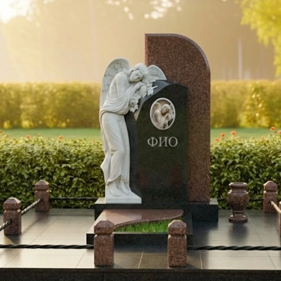 Форма стелы, сочетающая строгие линии с мягкими изгибами, символизирует баланс между незыблемостью вечной памяти и нежностью скорби. Арка, обнимающая стелу, олицетворяет защиту, покой и незримое присутствие, которое продолжает оберегать ушедшего. Фигура ангела, склонившегося в скорби, является мощным символом чистоты, защиты и вечной души. Ангел, оплакивающий усопшего, выражает глубочайшую скорбь, но при этом дарит надежду на вечное упокоение и встречу в ином мире. Эта композиция призвана дарить утешение близким, напоминая о том, что любовь и память живут вечно.