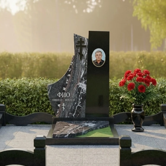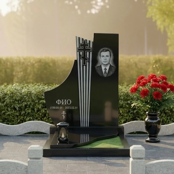 Стела этого ритуального изделия представляет собой гармоничное сочетание строгих линий и изящных изгибов. Основная часть, выполненная из высококачественного гранита, имеет глубокую черную полировку, которая, словно зеркало, отражает мир вокруг, символизируя бесконечность времени и памяти. Форма стелы асимметрична: правая сторона устремляется вверх прямым, уверенным силуэтом, а левая плавно опускается, создавая ощущение мягкого ниспадающего полотна или развевающегося флага. В верхней части стелы расположено рельефное изображение православного креста, выполненного в лаконичном, но выразительном стиле. Его грани имеют матовую обработку, что создает эффектный контраст с зеркальной поверхностью камня, подчеркивая священный символ и его значимость. Рядом с крестом, в верхней правой части, искусно выгравирован портрет усопшего, обрамленный овалом, который словно вписан в общую композицию, придавая ей завершенность и индивидуальность. Ниже портрета, в центральной части, выгравированы инициалы ФИО, выполненные строгим, но элегантным шрифтом. Под ними — еще один, более скромный, но не менее значимый православный крест, напоминающий о вере и надежде. Эти элементы не просто нанесены на камень, они глубоко интегрированы в его структуру, становясь частью единого художественного замысла.